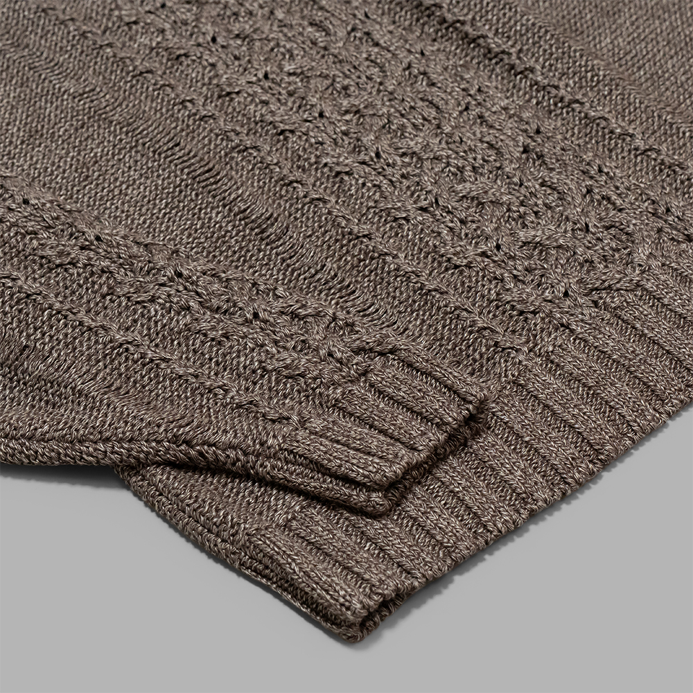 シルクとリネンを贅沢に使用したニットは、弾力性に富みながらも、しっとりと柔らかな着心地の良さがあります。また、エスプレッソと名付けたメランジ調の雰囲気のある色合いも魅力の1つです。