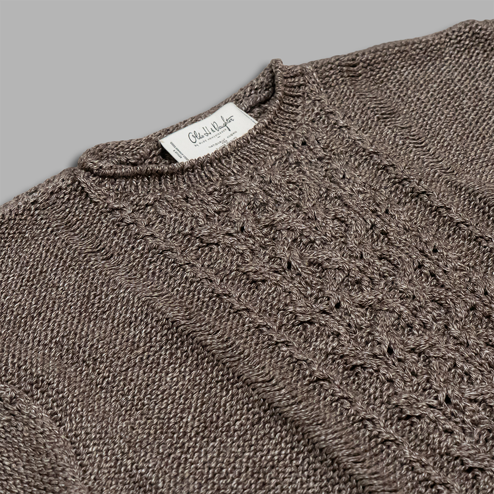 デザインは、ヨーロッパのフィッシャーマンセーターをベースに、ブランド独自のエッセンスを加えて、作製されています。肩や身頃にゆとりをもたせたボックスシルエットや、締め付けの少ない、ネックや裾リブからは、程よくリラックスした表情と色気を感じることができます。
