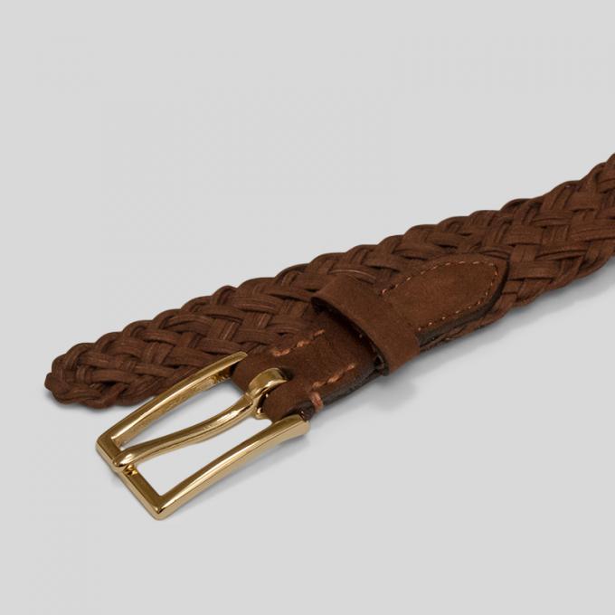 日本製のヌバックレザーを細くカットした物をテープ状に作り変え、さらに、それを2本2本束ねながら編み込んでいます。
