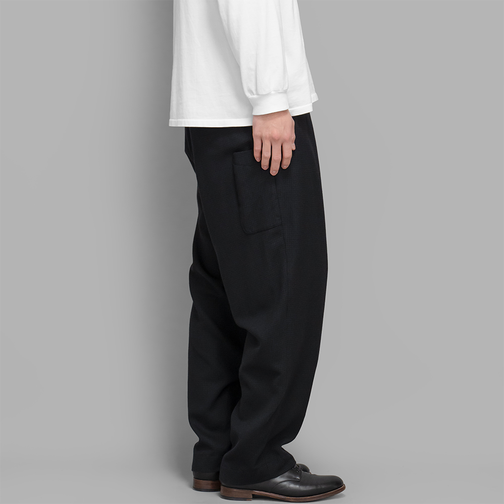 1990年代のフレンチスラックスのリラックスしたフォルムとイギリスのクラシックな仕立てをリファレンスとし、オリジナルパターンで製作されています。腰まわりにゆとりを持たせつつ、裾にかけて緩やかにテーパードするシルエットです。ディテールには、ペインターパンツによく見られるツールポケットがつき、前立てはジッパーフライの仕様です。