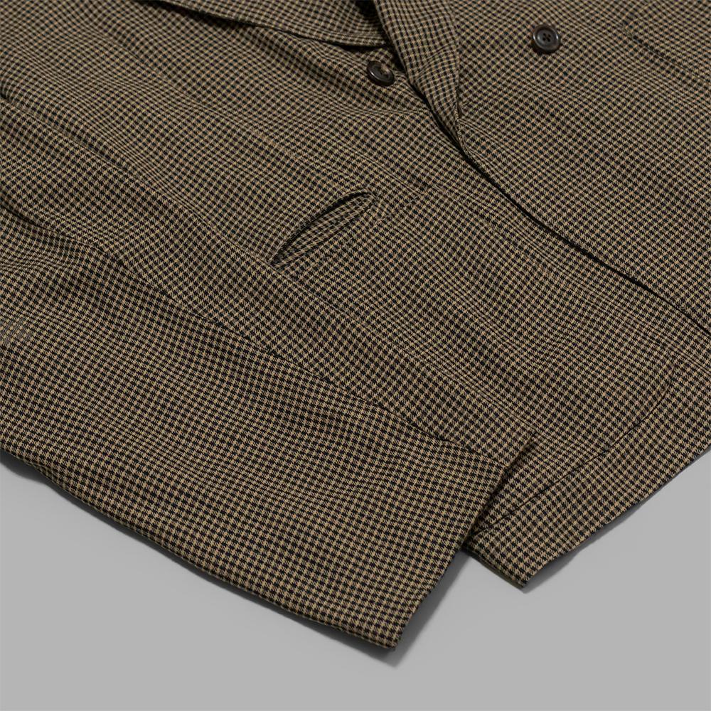 フランスのテーラードスタイルとイギリスのダブルブレストジャケットをリファレンスとしオリジナルパターンで製作されています。袖は立体的な一枚仕立てとし、ボタンの掛け位置で表情を変えられる設計も魅力の1つです。前面には3つのパッチポケットとチェンジポケットがつく仕様に、中にも2つのポケットがつき、実用性も兼ね備えています。また、中には引っ張りがついているため、ボタンに留めて着用も可能です。
