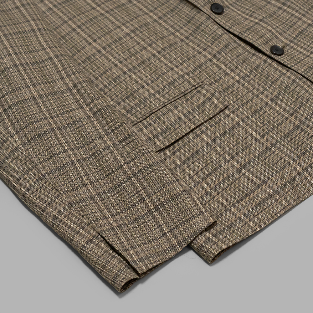 生地はシルクノイルとリネンによる三つ糸をタテ、ヨコに用いたチェック柄のサマーツイードを使用しています。シルクノイルの自然な表情と、リネンの清涼感やハリ感が調和し、新たな質感の軽やかなツイードに仕上がっています。