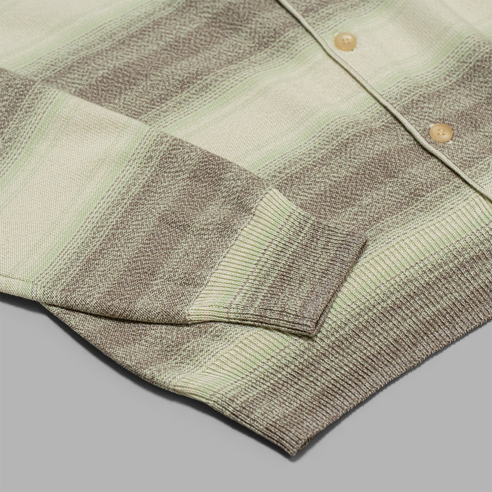 上品な光沢をもつコットンシルクの強撚混紡糸を色構成の異なる複数のコード糸に仕立て、なめらかなグラデーションを描くように、細やかに切り替えながら丁寧に編み上げたニットです。シルク特有の滑らかさとしなやかさが加わり、優れた肌触りと快適な着心地を備えています。