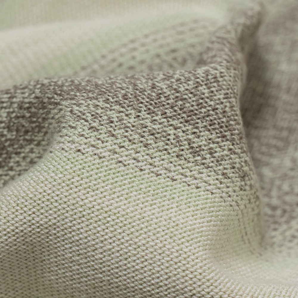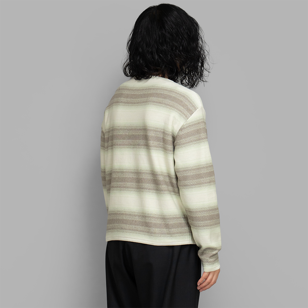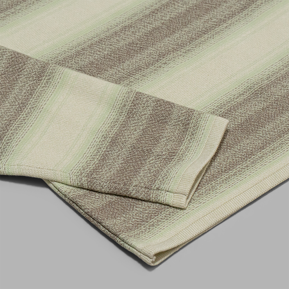 上品な光沢をもつコットンシルクの強撚混紡糸を色構成の異なる複数のコード糸に仕立て、なめらかなグラデーションを描くように、細やかに切り替えながら丁寧に編み上げたニットです。シルク特有の滑らかさとしなやかさが加わり、優れた肌触りと快適な着心地を備えています。