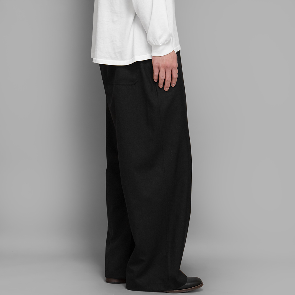 細番手の上質な糸を使用したウール素材を使用しています。夏場にも穿けるくらい肌触りが良く、シャリ感がある生地になります。また、非常に軽量で、加工によりシワになりにくい性質を持っていることも特徴の1つです。