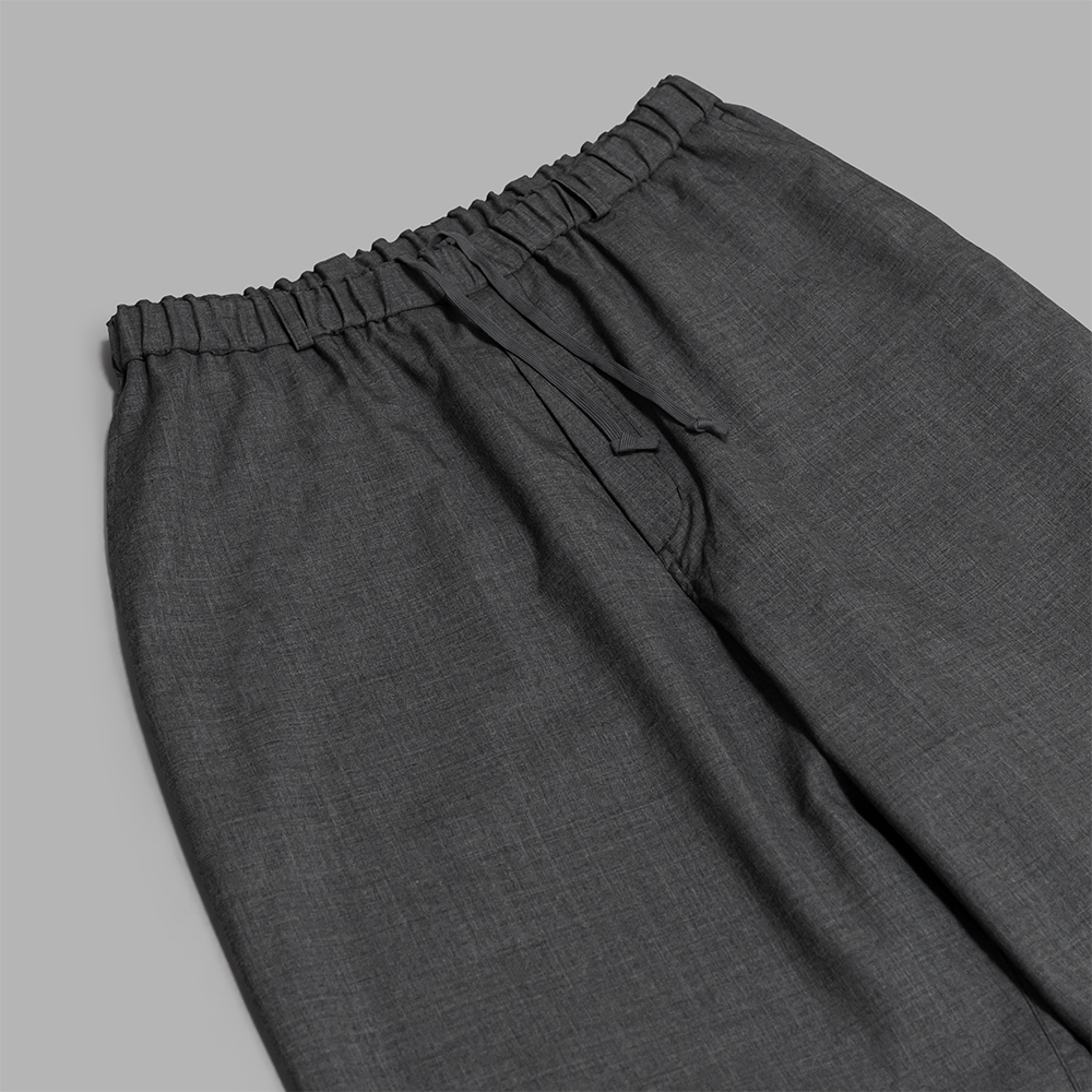 型はMITTANの定番であるストレートシルエットのパンツで、程よいゆとり感と適度な丈感が特徴です。ウエストはゴム仕様になっており、内側の紐でベルトなしでも快適に着用できますが、ベルトループも配しているため、ポケットをしっかり活用する際などにベルトを使用することも可能です。