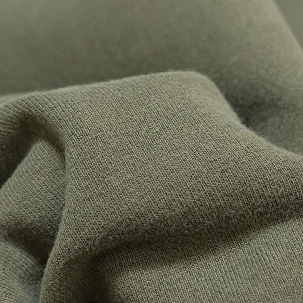 表地はヴィンテージを解析して作った吊り裏毛です。1時間に1メートルというゆっくりとしたスピードでしか編み立てられない分、糸に余計な負荷を掛けないで編み上げることができるため、肉厚ながら固くならず、ふっくらとした風合いに仕上がります。カラーは、USMCの特徴的なオリーブドラブの色味を再現したものになります。
