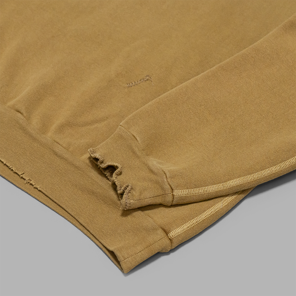 デザインは、ネック部分の前後にガゼットが付く、通称”両V”スウェットがベースです。ヴィンテージの薄く伸びきって緩くなったリブや、Vガゼットの歪みなどをあえて再現し、崩れたシルエットに設計しています。