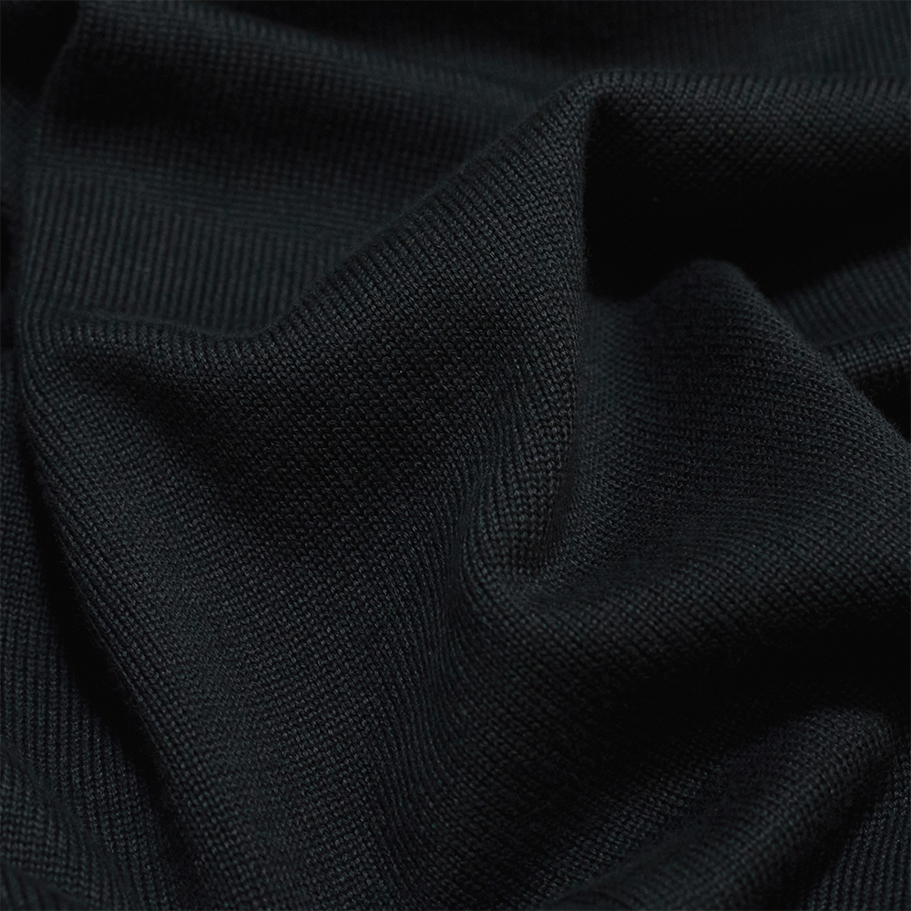 上質な細番手のコットン糸を4本取りすることで、しっかりとした肉感を備えながら、しっとりとした滑らかさと光沢のある素材に仕上げています。体のラインが出過ぎないよう、14ゲージの度詰めで編み立てていることもポイントです。