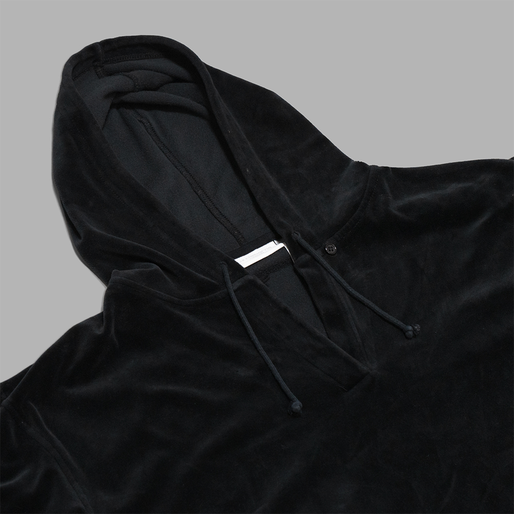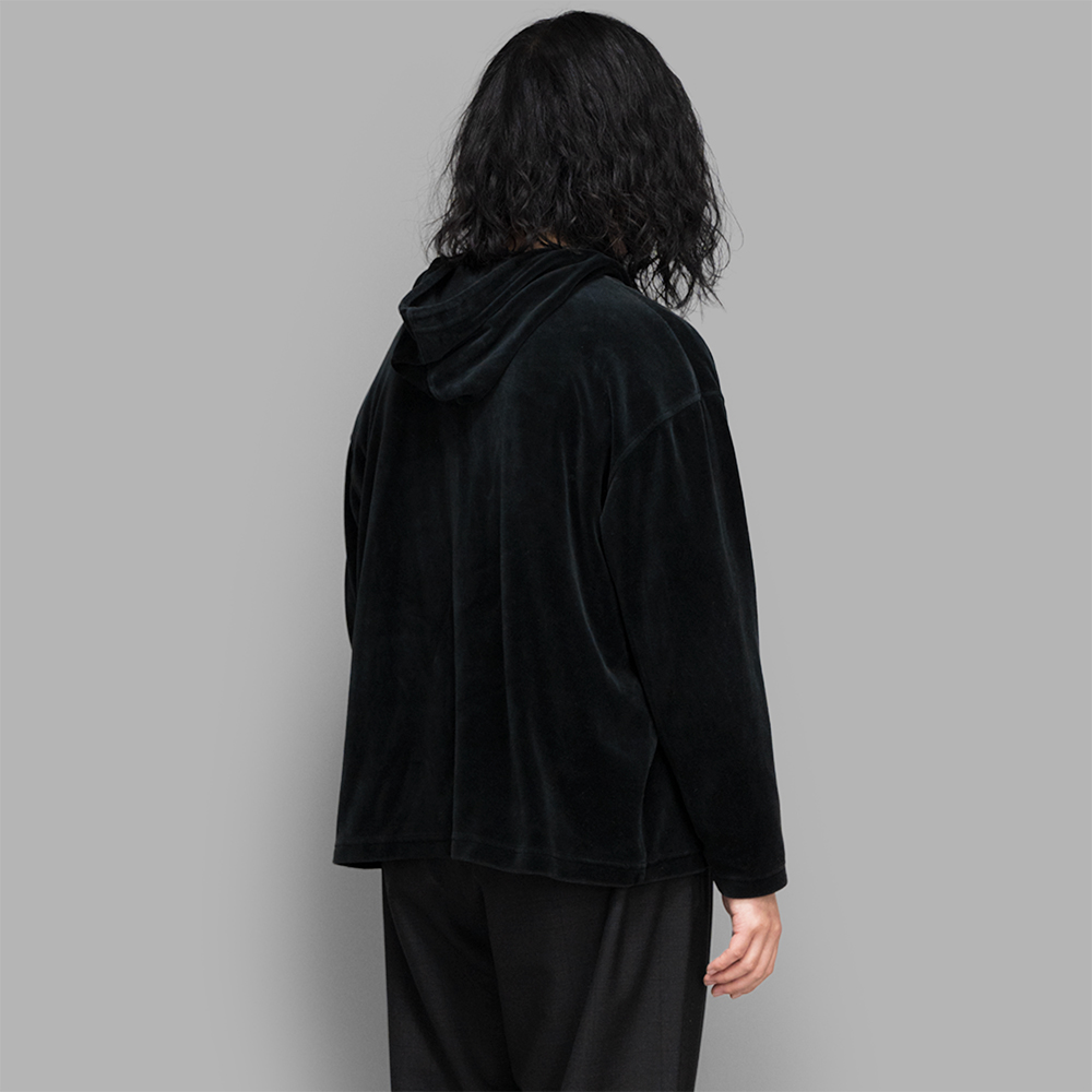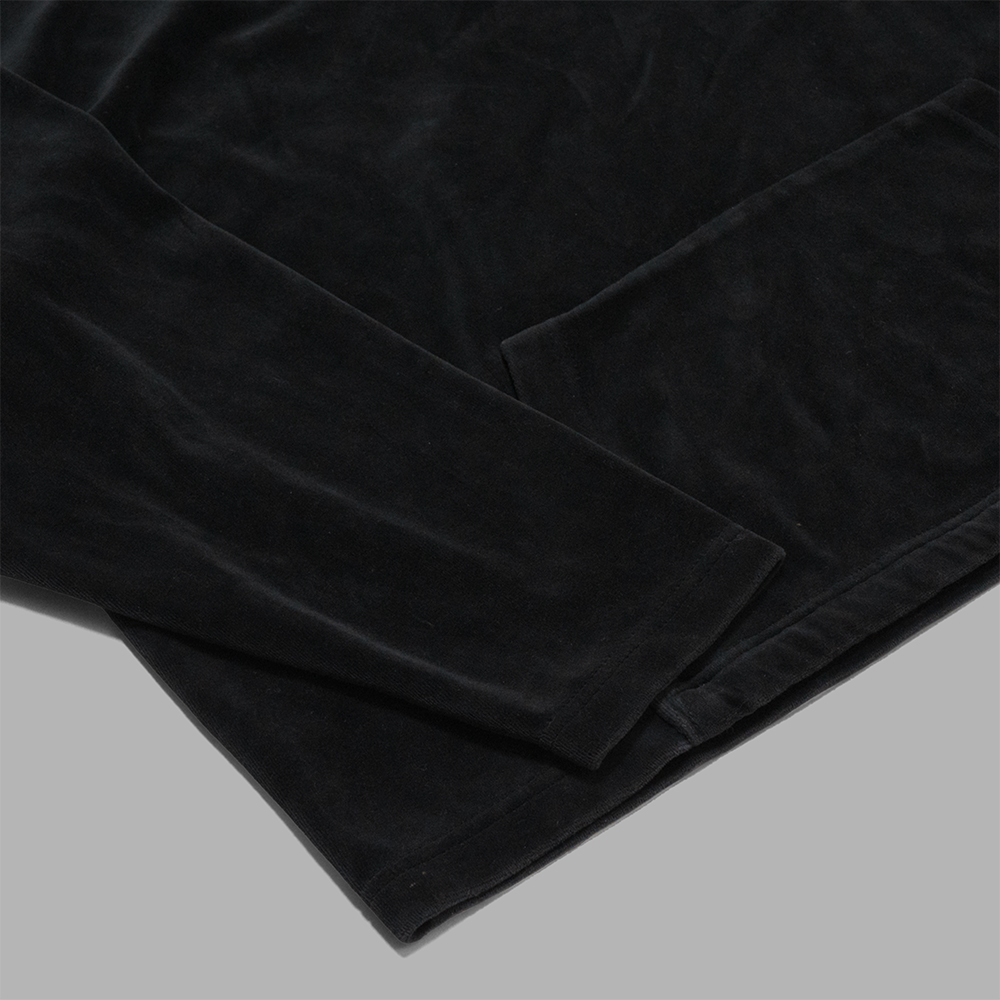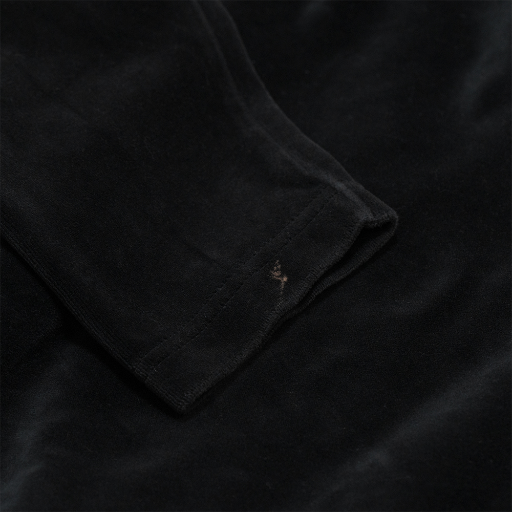 素材はコットンをベースとした薄すぎず、厚すぎない肉感のベロアが採用されています。程よく抑えられた上品な光沢と柔らかい肌触りに加え、ポリエステルを混紡させることにより、適度なストレッチ性のある生地になっています。