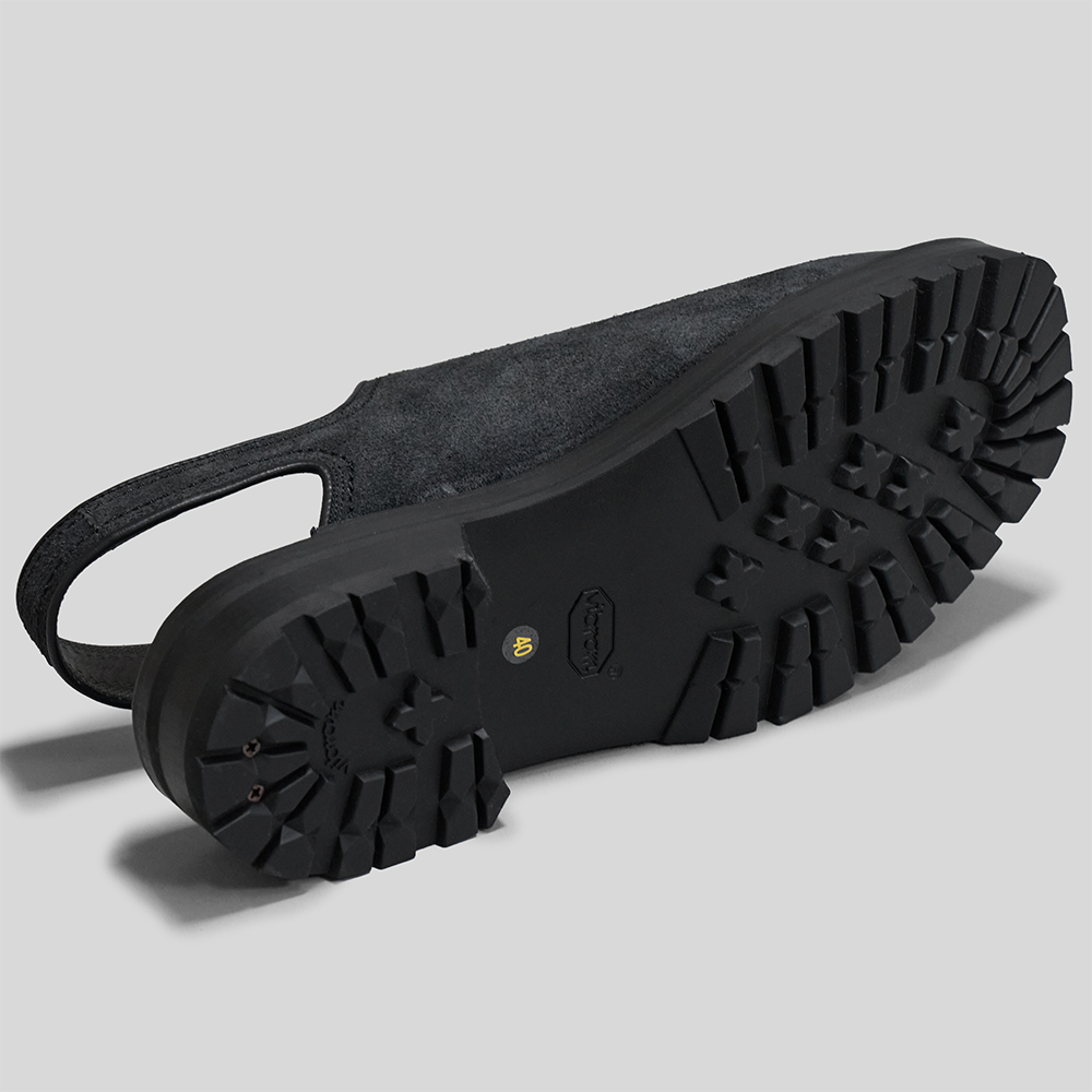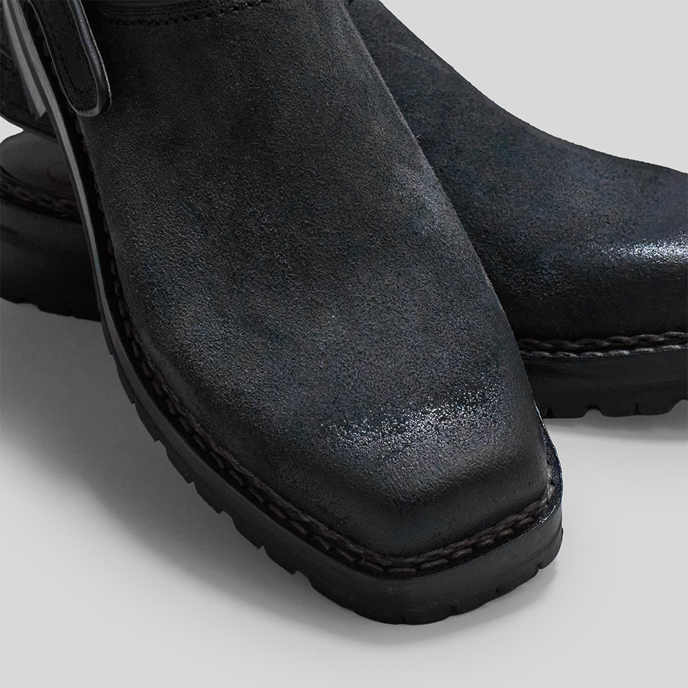 素材にはイタリア・トスカーナのテンペスティ社のVacchetta Elbamattの裏面の革を使用しています。100%植物由来で鞣されたベジタブルタンニンレザーは、油分を含むしっとりとした質感と荒さの残るナチュラルなスウェード面が特徴的です。トゥ部分のみ毛足を潰し、磨きを施すことにより、適度な光沢感が生まれ、深みのある表情に仕上がっています。
