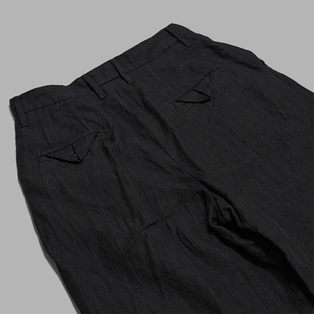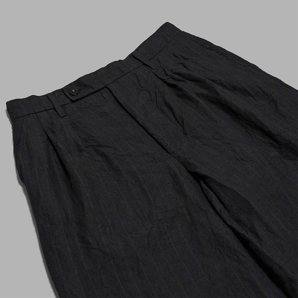 デザインはディティールを抑えながらも、シルエットで特徴をもたせています。イン・アウトで使い分けた2タックによる腰回りのボリュームと深めに取られた股上。裾は絞り、丈は九分丈で短めに設定することで、特徴的なシルエットに仕上げています。前立てはボタンフライで、中は裏地のない一重の仕様です。