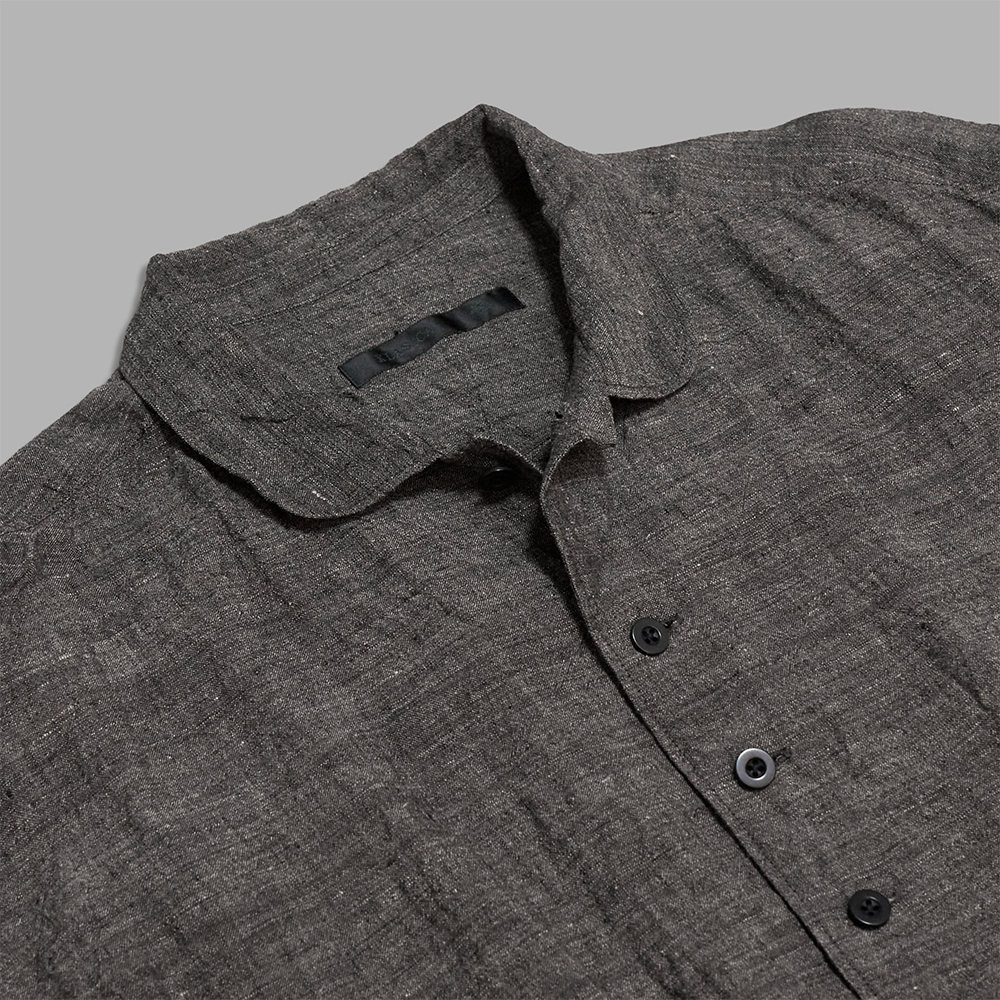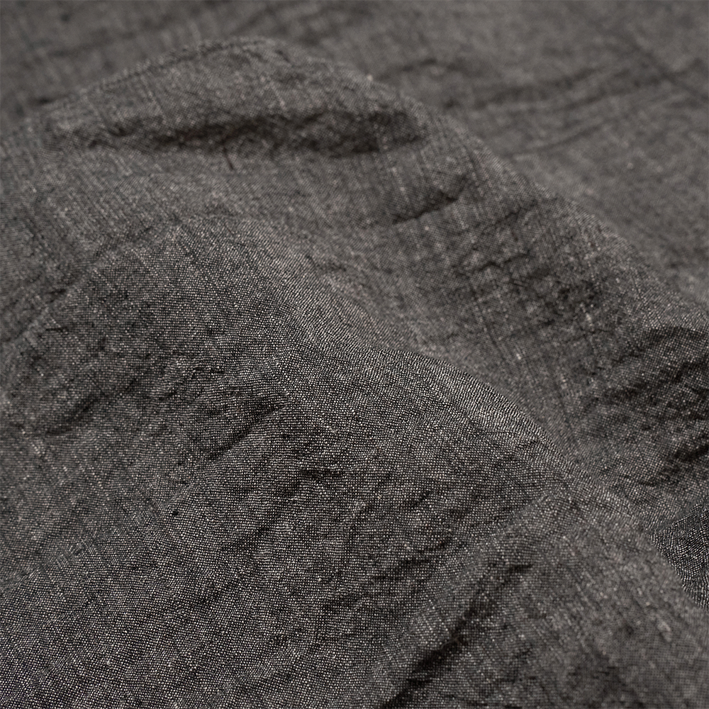 素材は、東洋とも西洋とも見える古い色調を目指したリネンを使用したシャンブレー生地です。太番手糸を程よく甘織りで織り、仕上げに製品加工を施すことで、空気を含んだかのような軽やかな生地感に仕上げています。