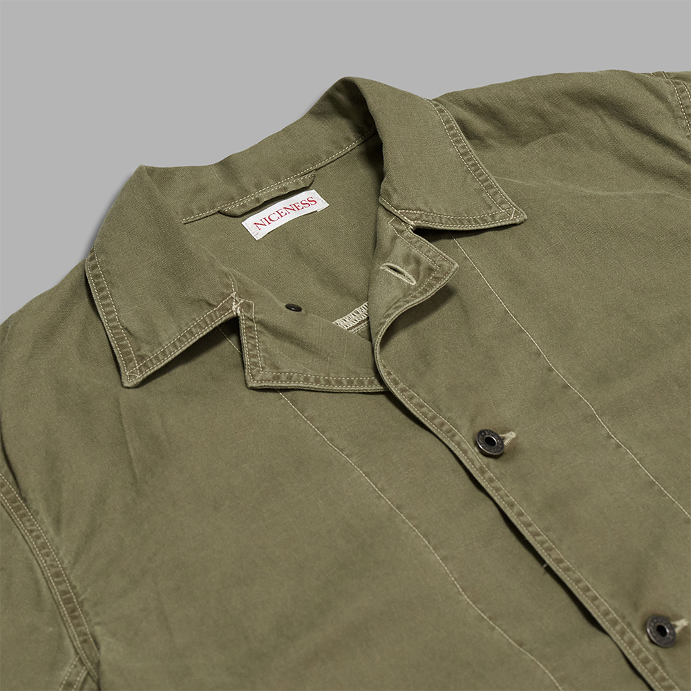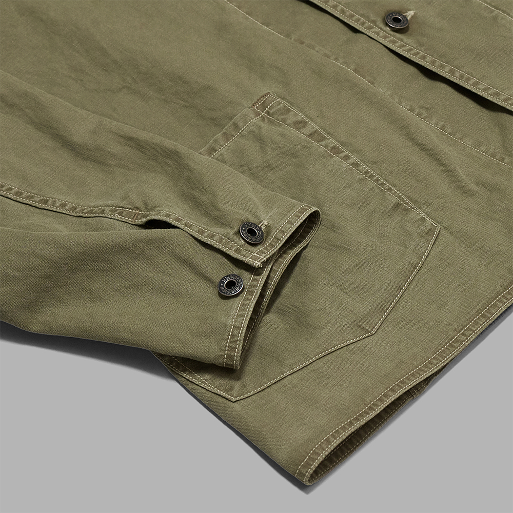 ワークウェアの実用性と日本の衣服に宿る造形美が交差する静かな緊張感を纏ったアイテムに仕上がっています。風合いやディテールなど、本格的なミリタリーをベースとしながらも、薄手の生地を使用しているため、カットソーなどの上からシャツ感覚で羽織りやすいのも特徴の一つです。