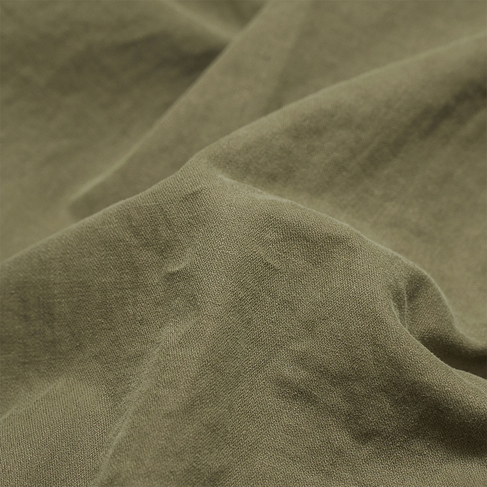 素材は、リネン×コットン混紡の太番手単糸の生地を使用しています。加工によって生まれる落ち感や、素材のふくらみがシャリ感の中にも優しい肌触りを感じさせ、現代のワークウェアとしての快適性と完成度を高めています。また、硫化染めによる色出しと製品加工により、経年変化を楽しめる一着です。