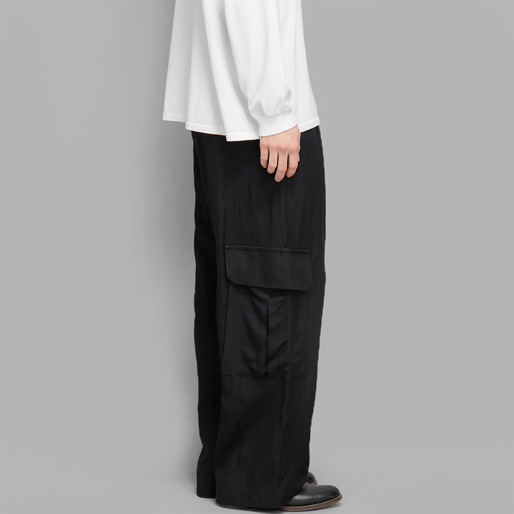 同ブランドが得意とするスラックスをベースに、無骨な印象のカーゴパンツを素材感で柔らかな印象に仕上げています。また、バック部分のみイージー仕様を取り入れることで、見た目は一般的なトラウザーズでありながら、ウエストの収まりが良く、裏地がないので春先から秋先にかけて着用しやすいアイテムです。暑い時期のシンプルなスタイリングにも変化をつけてくれます。