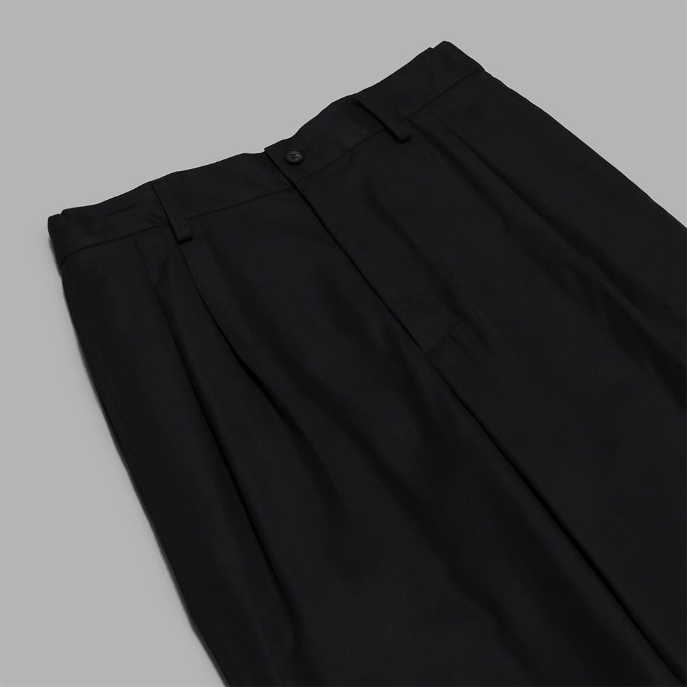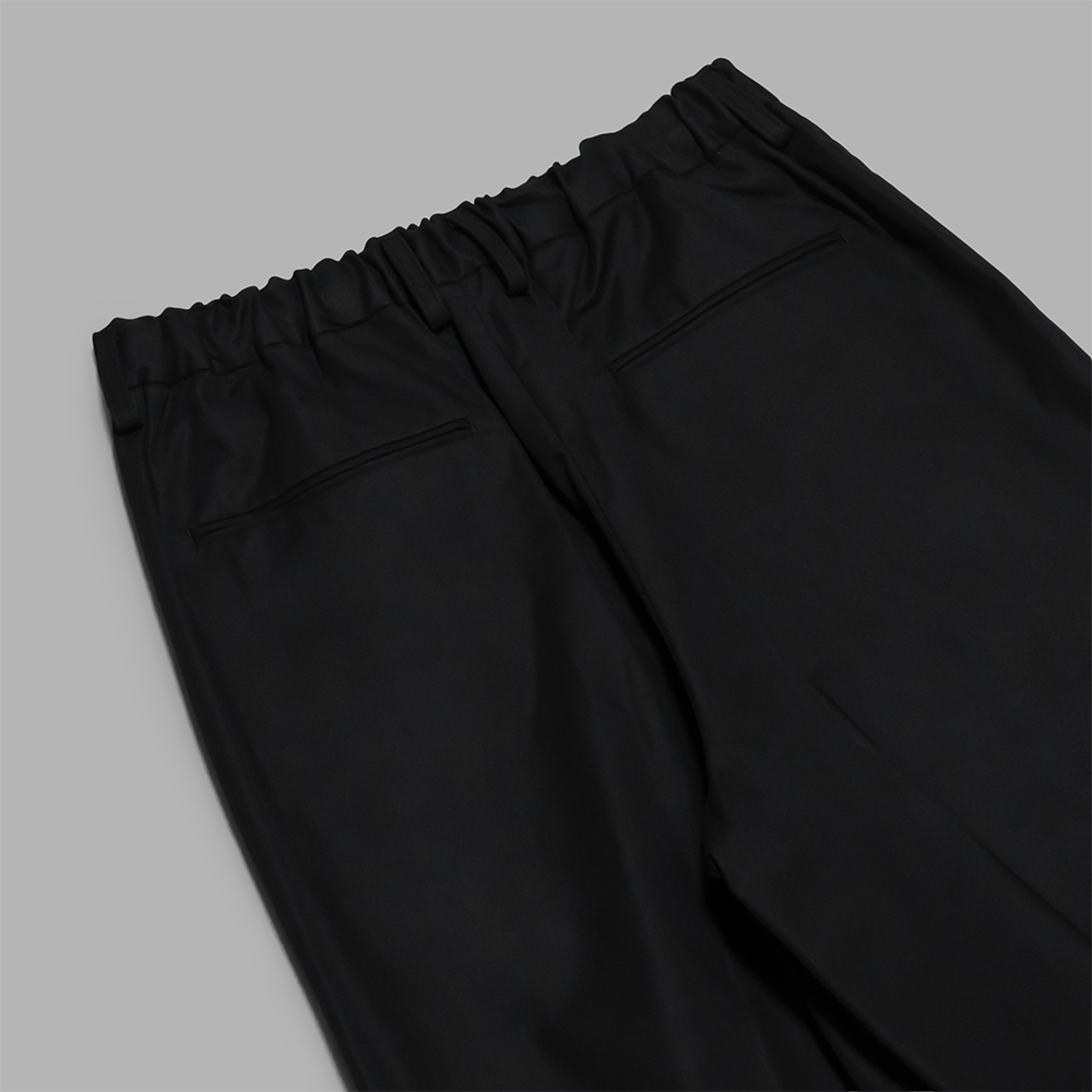 型はわたり幅から裾幅までワイドに設定し、バック部分のみイージー仕様で製作されたツータックトラウザーズです。丈はEXTRA WIDE TROUSERSとほぼ同じで、同ブランドが展開される他のトラウザーに比べると若干長めに設定され、縦方向への落ち感の印象を強くしています。前立てはジップ開き、裏地はありません。