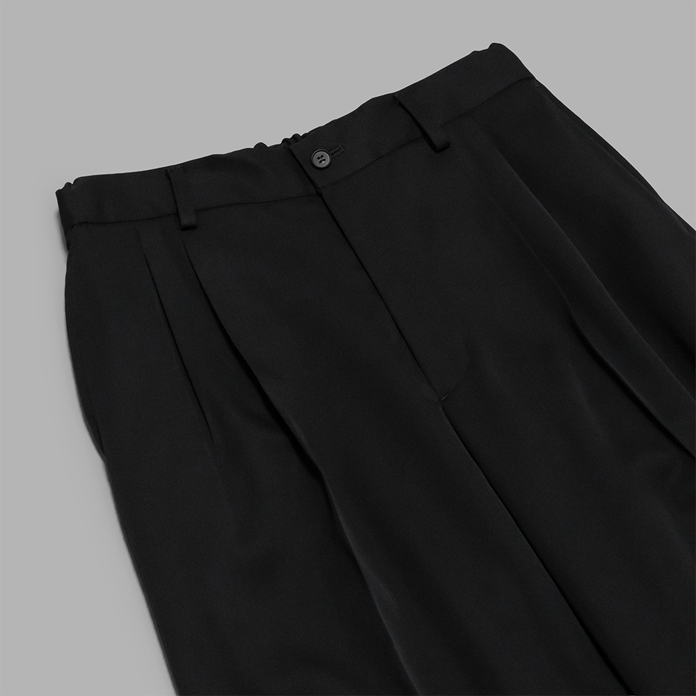 型はわたり幅から裾幅までワイドに設定し、バック部分のみイージー仕様で製作されたツータックトラウザーズです。丈はEXTRA WIDE TROUSERSとほぼ同じで、同ブランドが展開される他のトラウザーに比べると若干長めに設定され、縦方向への落ち感の印象を強くしています。前立てはジップ開き、裏地はありません。