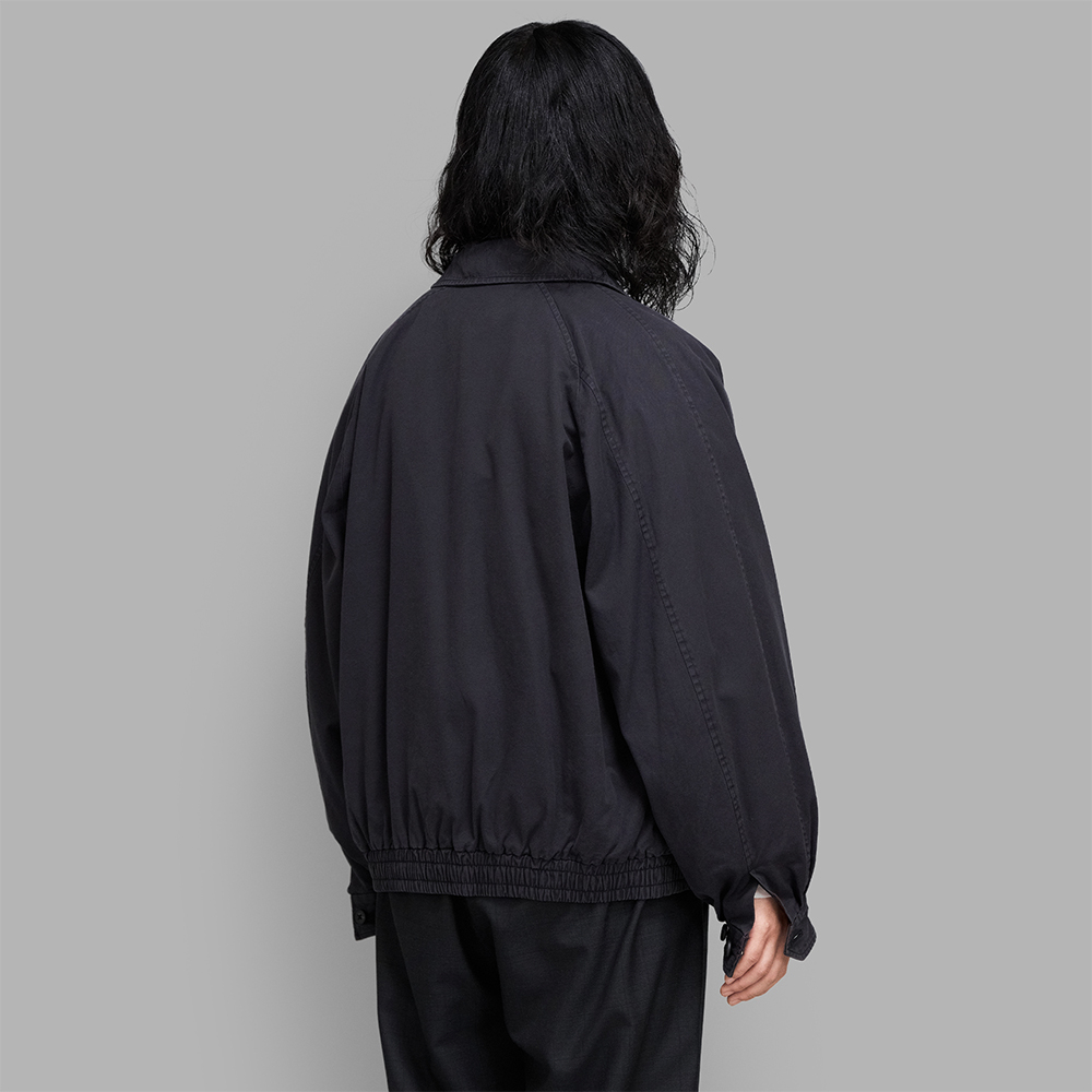 型は、ヴィンテージのジャケットをベースに、全体の表情や各ディテールを調整し製作されたハリントンジップジャケットです。袖はアームホールにしっかりとゆとりを持たせたラグランの仕様で、身幅にもゆとりを持たせつつ、着丈は程よくスッキリとさせています。襟は立ててボタンで留めての着用ができ、チンストラップも付きます。内側は極薄の中綿を入れ保温性と膨らみをもたせ、内ポケットが左右に一つずつ付きます。