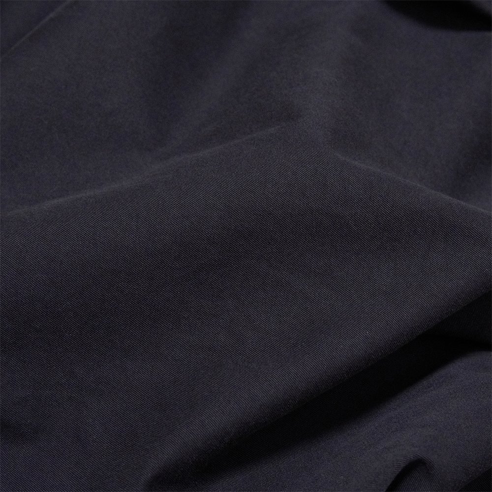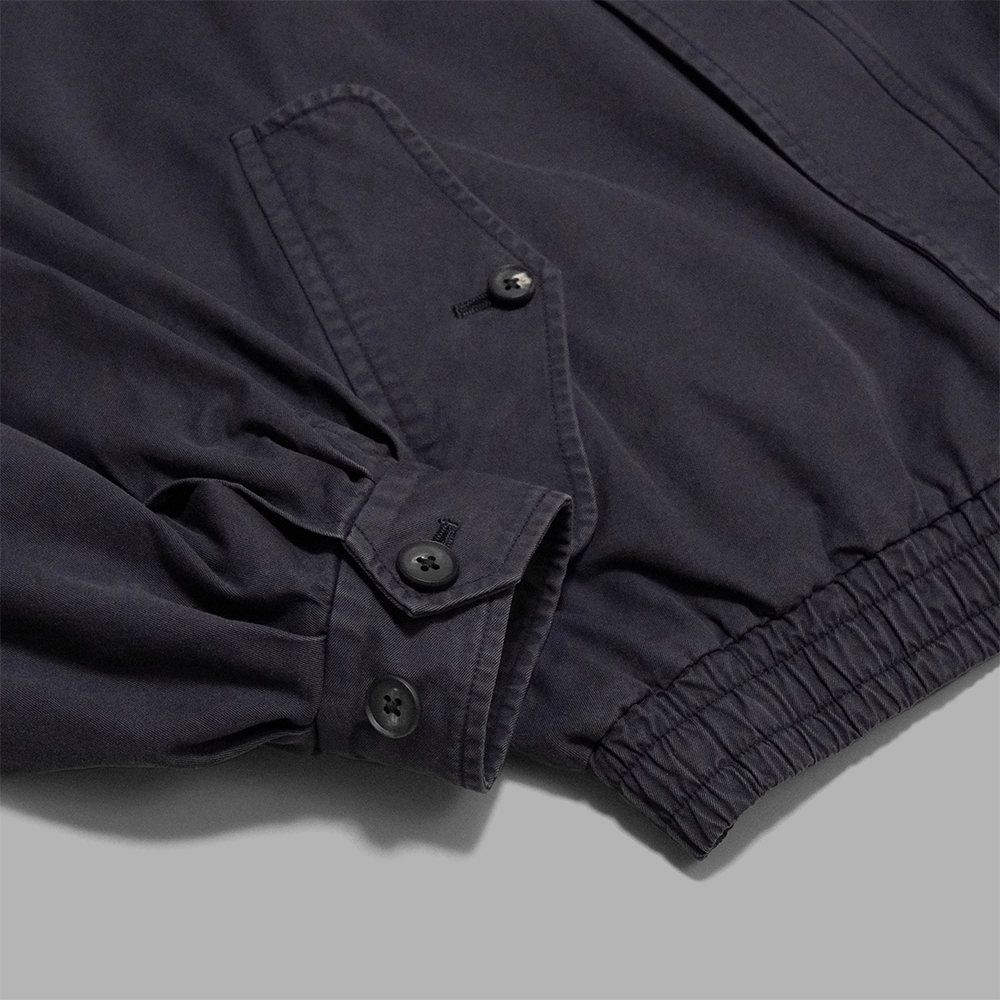 素材は、タテ・ヨコ糸共に超長綿のスーピマコットンの60双先染め糸を使用し、高密度に織り上げたギャバジンに、撥水加工を施した素材を使用しています。縫製後にボールを使用したバイオ加工、吹き付けの加工を施し、パッカリングやタマムシの色味にニュアンスを表現し、着古したような全体の印象に仕上げています。