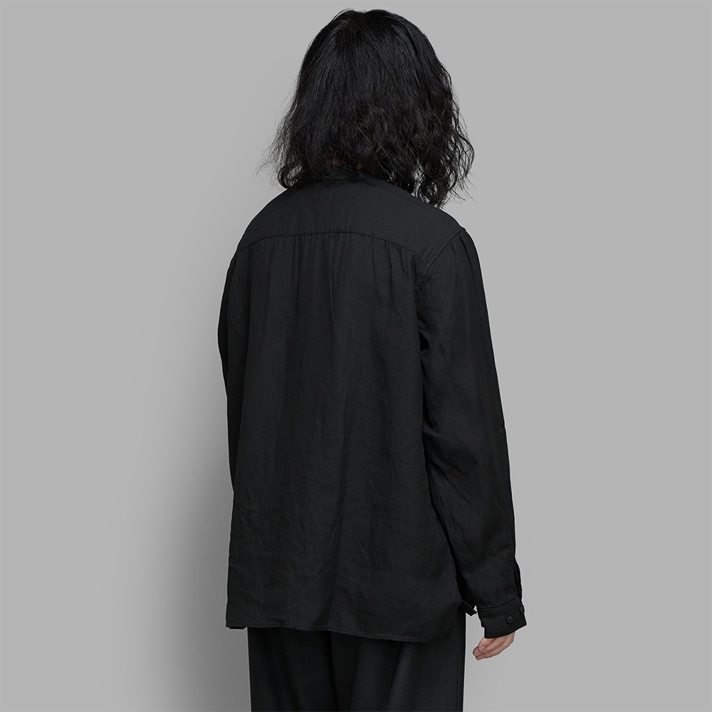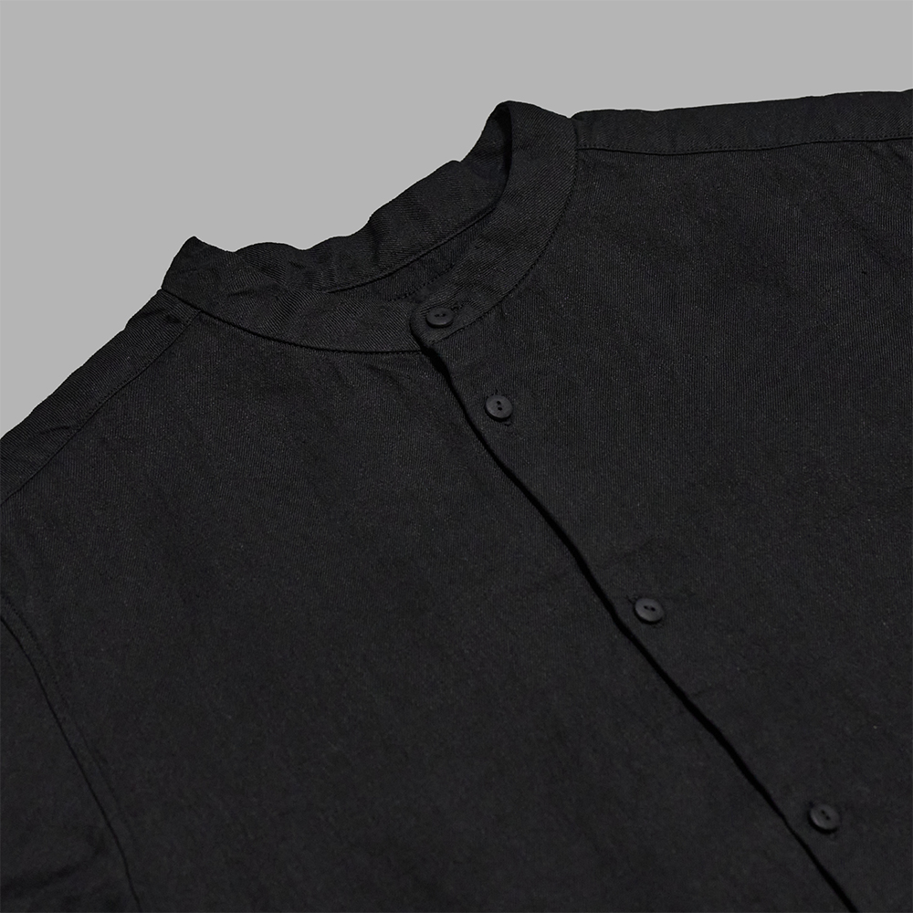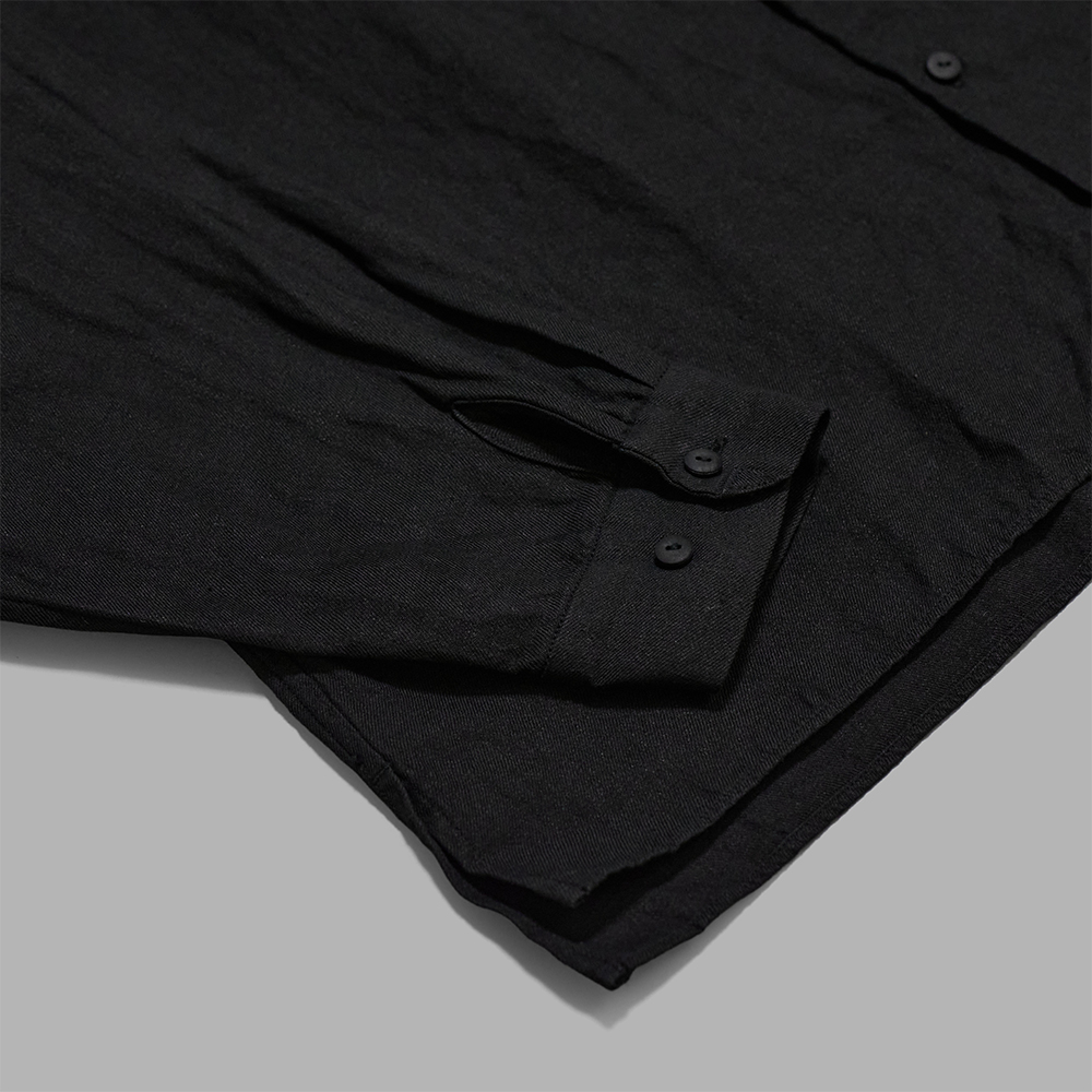 程よくゆとりを持たせたオーバーサイズのシルエットで、やや短めの着丈に設定したシャツです。生地の持つ自然なシワ感や表情を活かすため、強度が求められる箇所以外では表に出るステッチを最小限に抑えています。カフスの先は、紙を折る様子を参考に折り畳んで縫い止めており、袖口のボタンを開閉する際に目で見なくとも手の感覚で留め位置を探りやすくしています。ボタンには綿素材を圧縮したものを使用しており、製品染めの際に生地とともに染まることで統一感のある雰囲気に仕上がっています。