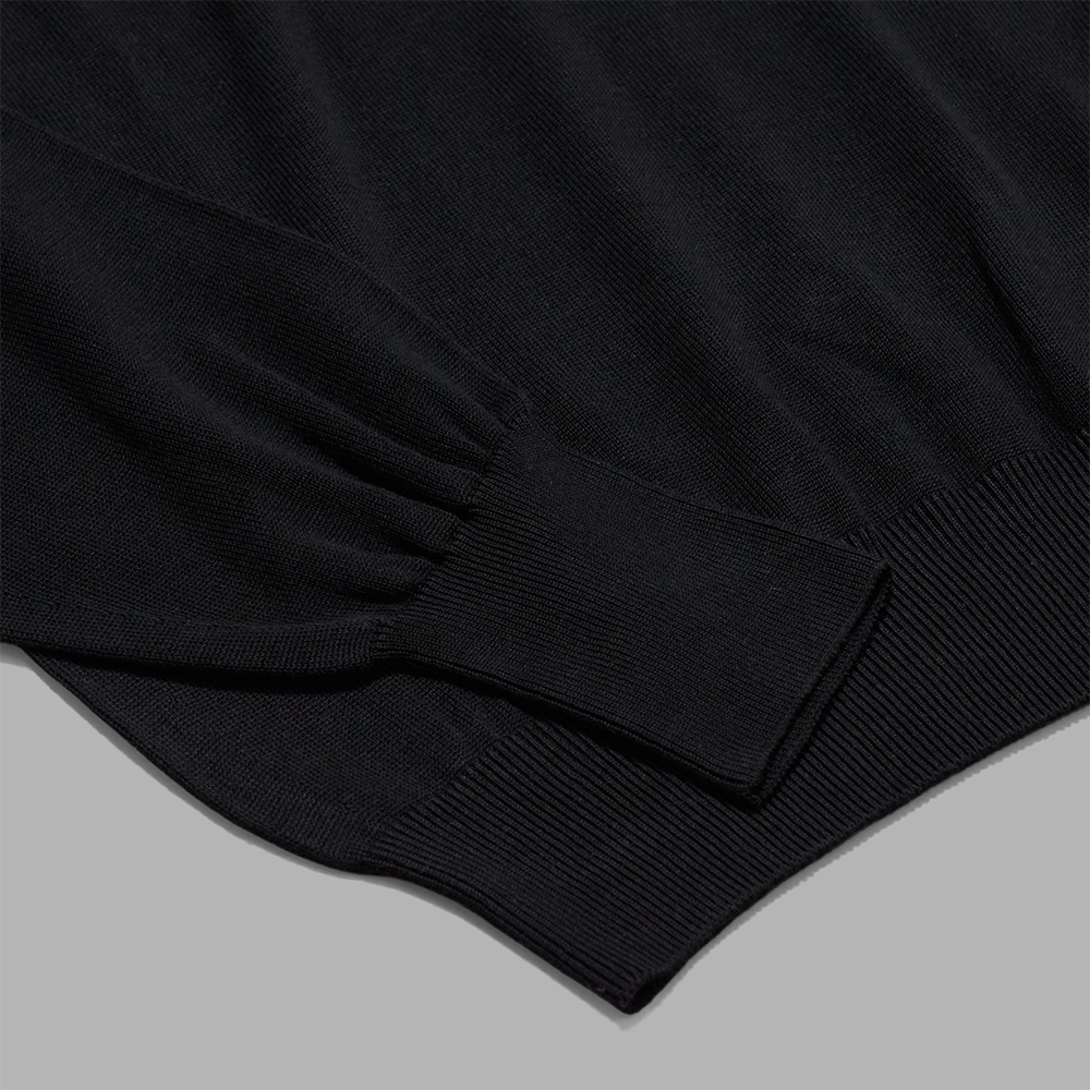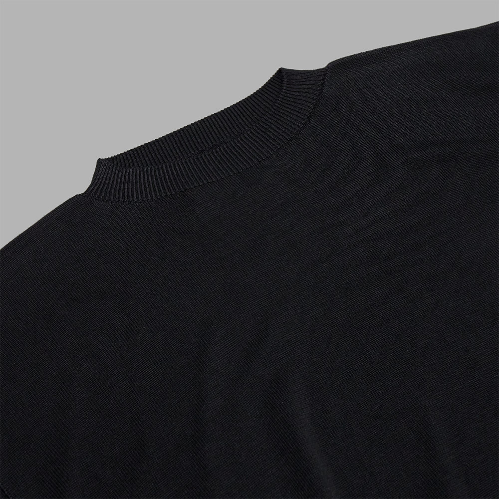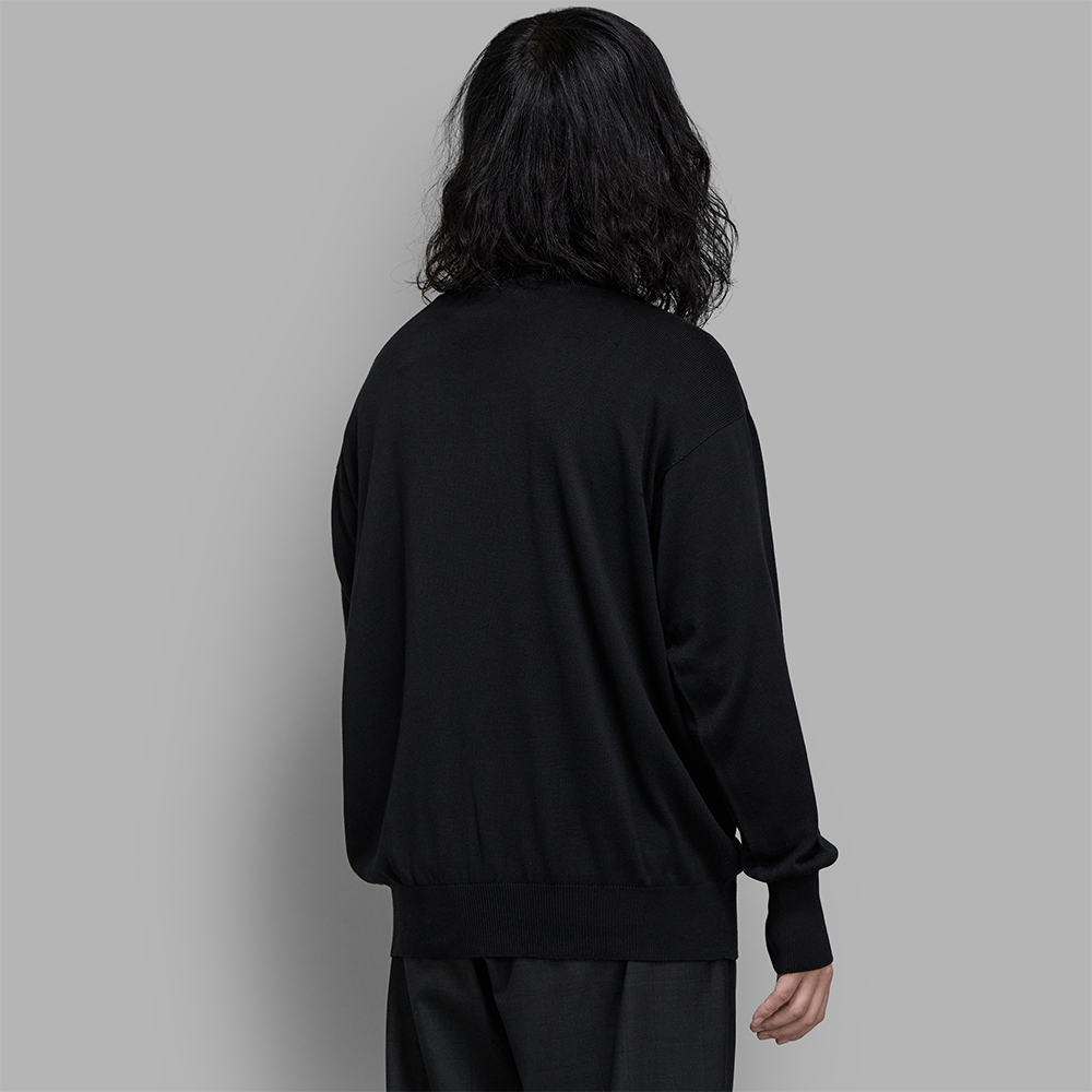 ボディはホールガーメントによる丸編み仕様で作られています。縫い代のごろつきがなく、立体的に編み上げられることで、身体のラインに自然に沿う着用感を実現しています。シルク本来の質感をダイレクトに感じられるのも特徴です。ゆとりのあるボディバランスに、ネックリブは程よく高さを持たせ、全体の印象を引き締めています。袖リブは折り返しても、そのままでも着用可能で、スタイリングに応じて印象を変えることが可能です。
