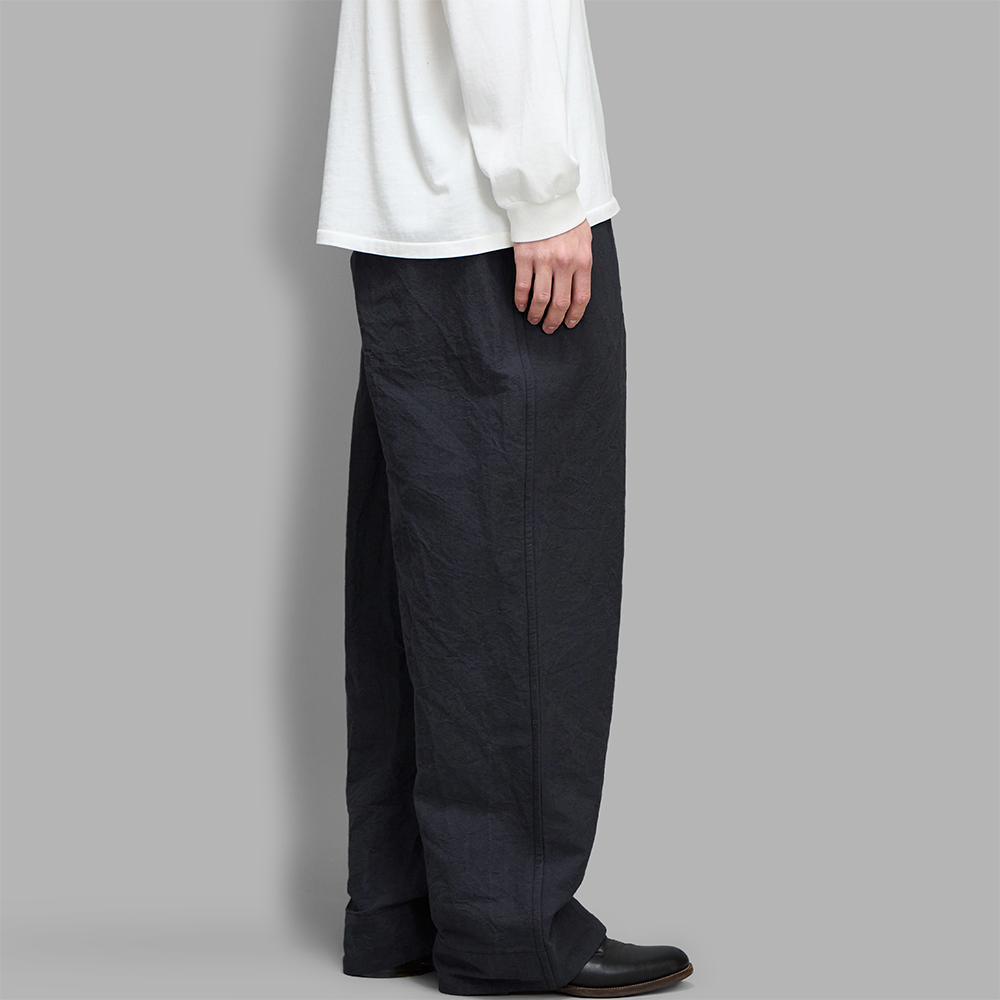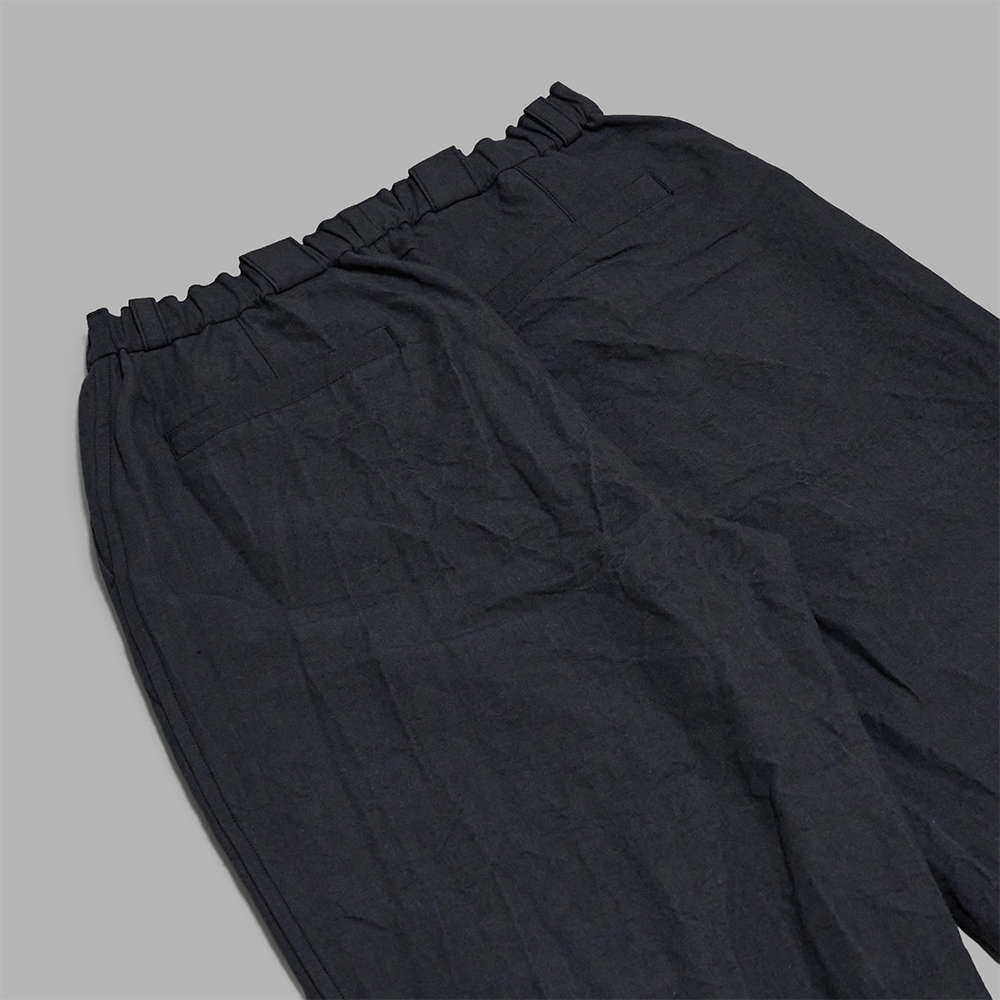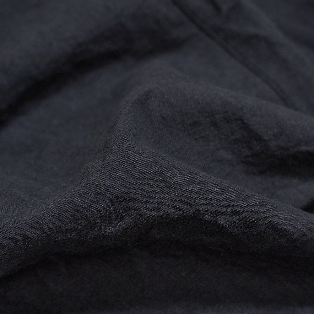 生地のハリとカラッとした質感により、肌にまとわりつきにくく、真夏でも快適に着用いただけます。また、天然素材ならではの風合いを活かした奥行きのある表情は、同ブランドが展開する麻や絹のトップスをさらりと合わせるだけで、シンプルながらも雰囲気のあるスタイルを演出します。春から秋口まで、シーズンを通してお楽しみいただける一本です。