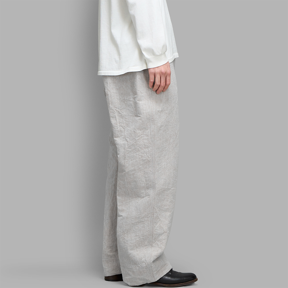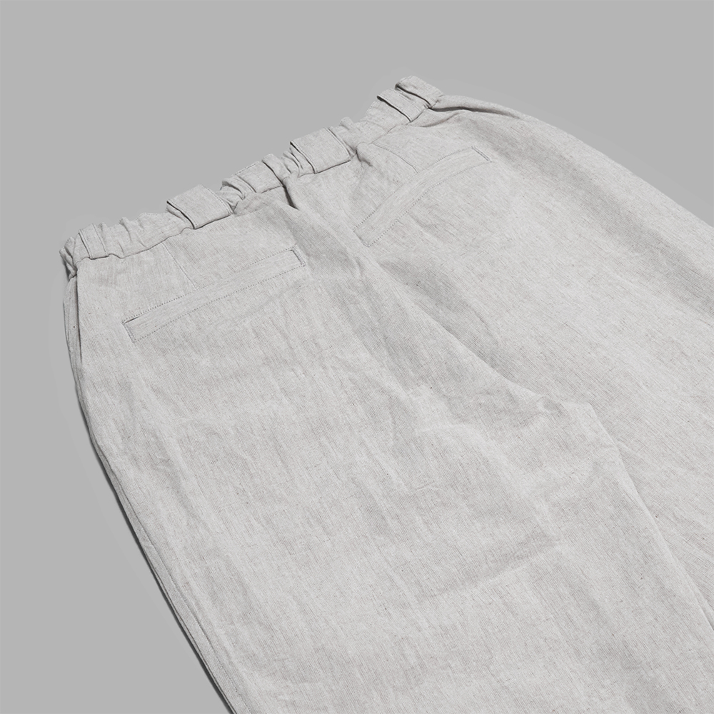 生地のハリとカラッとした質感により、肌にまとわりつきにくく、真夏でも快適に着用いただけます。また、天然素材ならではの風合いを活かした奥行きのある表情は、同ブランドが展開する麻や絹のトップスをさらりと合わせるだけで、シンプルながらも雰囲気のあるスタイルを演出します。春から秋口まで、シーズンを通してお楽しみいただける一本です。