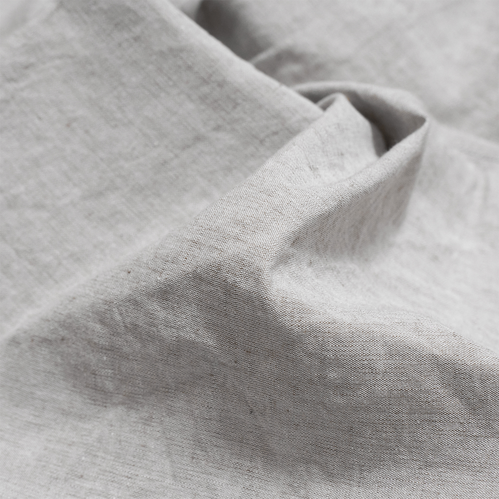 静岡・浜松で旧式のシャトル織機を使用して織り上げられた、高密度の経糸に綿、緯糸に麻(リネン)を使用した織物です。シャトル織機は、最新の織機に比べてスピードは遅いものの、緯糸を一本一本丁寧に打ち込むことで、生地にしっかりとしたコシとハリ感が生まれます。この打ち込みが、麻のさらりとした質感と綿のやわらかさを引き立て、ペーパーライクな軽やかさと強度を両立した生地に仕上がっています。