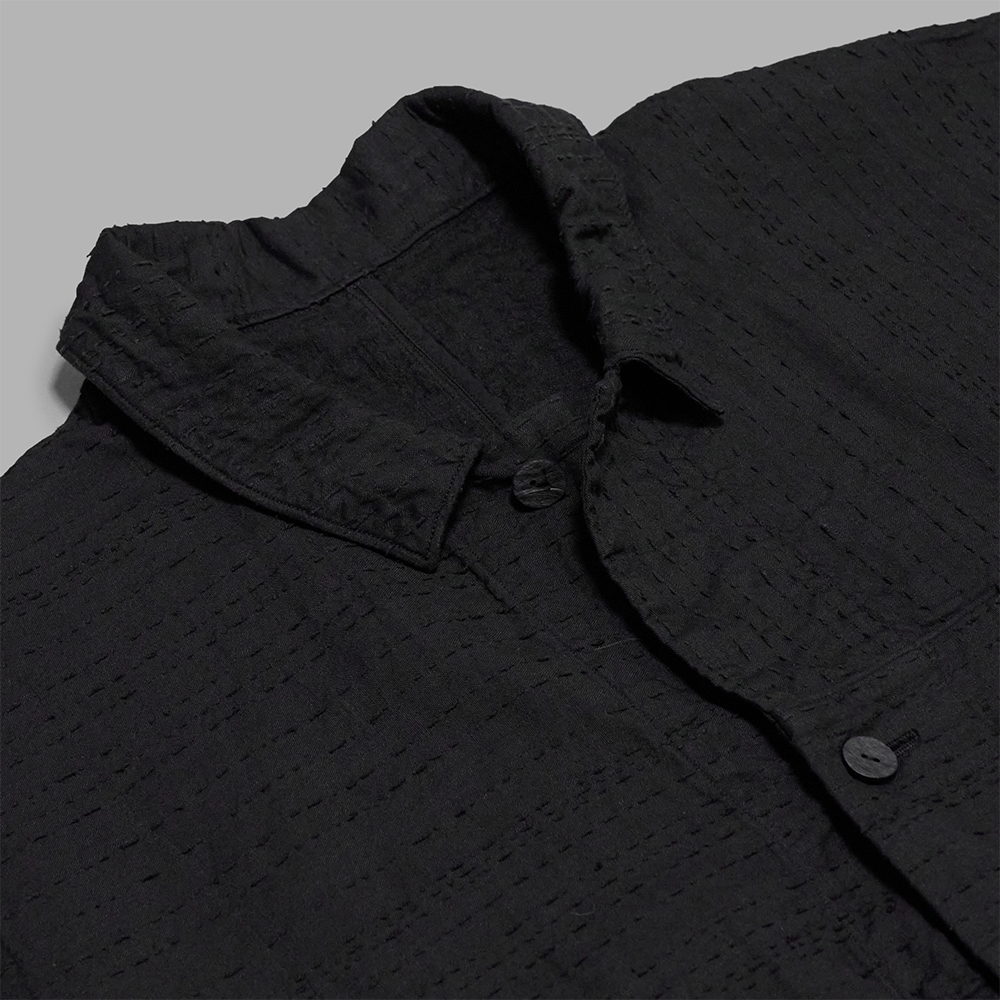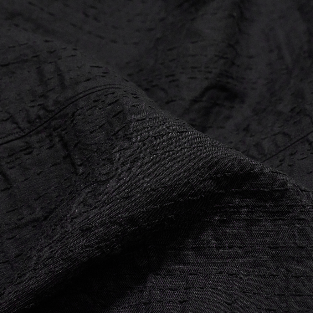 この生地では、その手作業の不規則さを機械で再現するのではなく、機械織りだからこそ生まれる規則的な構造を活かし、秩序の中にリズムを感じさせる独自の柄として設計しています。日本の伝統的な縫製仕様をベースにしながらも、現代の衣服へと自然に繋がるよう再構築された、同ブランドならではの一着です。スタイルを選ばず、着こなしの幅も広く楽しんでいただけます。
