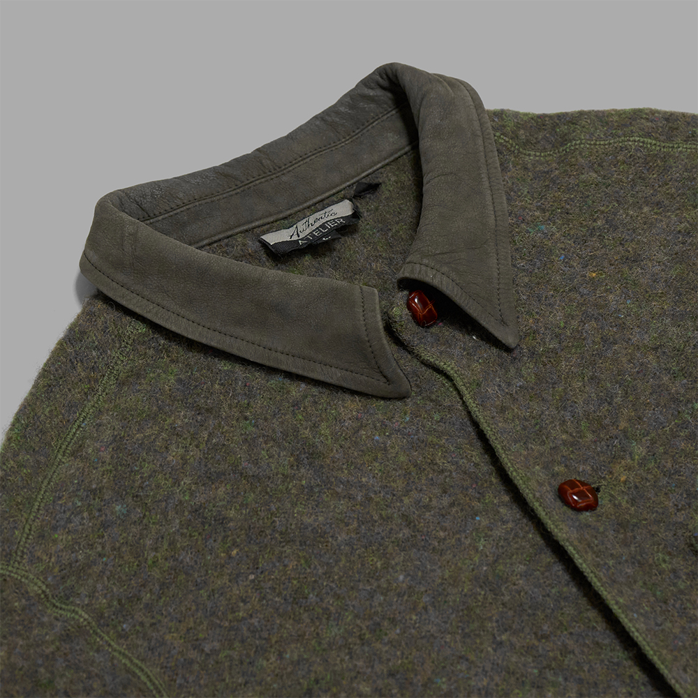 多色の糸で編み込まれたミックスニット素材を使用しています。随所に見られるネップや温かみを感じさせる表情が特徴です。襟はボディーの素材と好相性なヌバックレザーが採用されています。