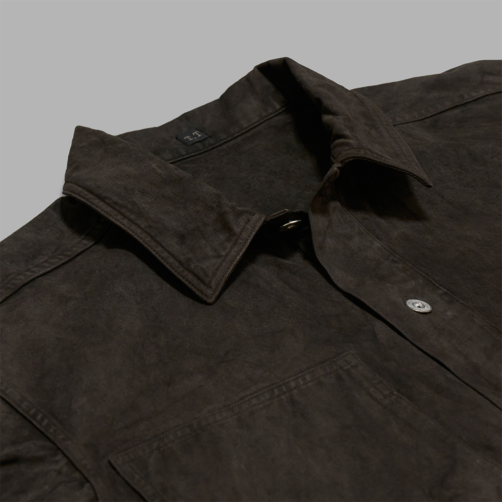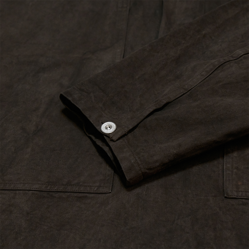 素材には綾目の綺麗なコットンツイル素材を使用しており、厚すぎない生地でありながらもハリコシのあるタフな生地感が特徴的です。また、天然染料を用いた泥染によるムラ感やステッチのアタリなど、とても雰囲気のある生地に仕上がっています。ボタンには、US ARMYの文字を削ぎ落として製作した、ミニマルなオリジナルボタンを採用しています。