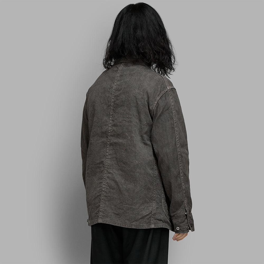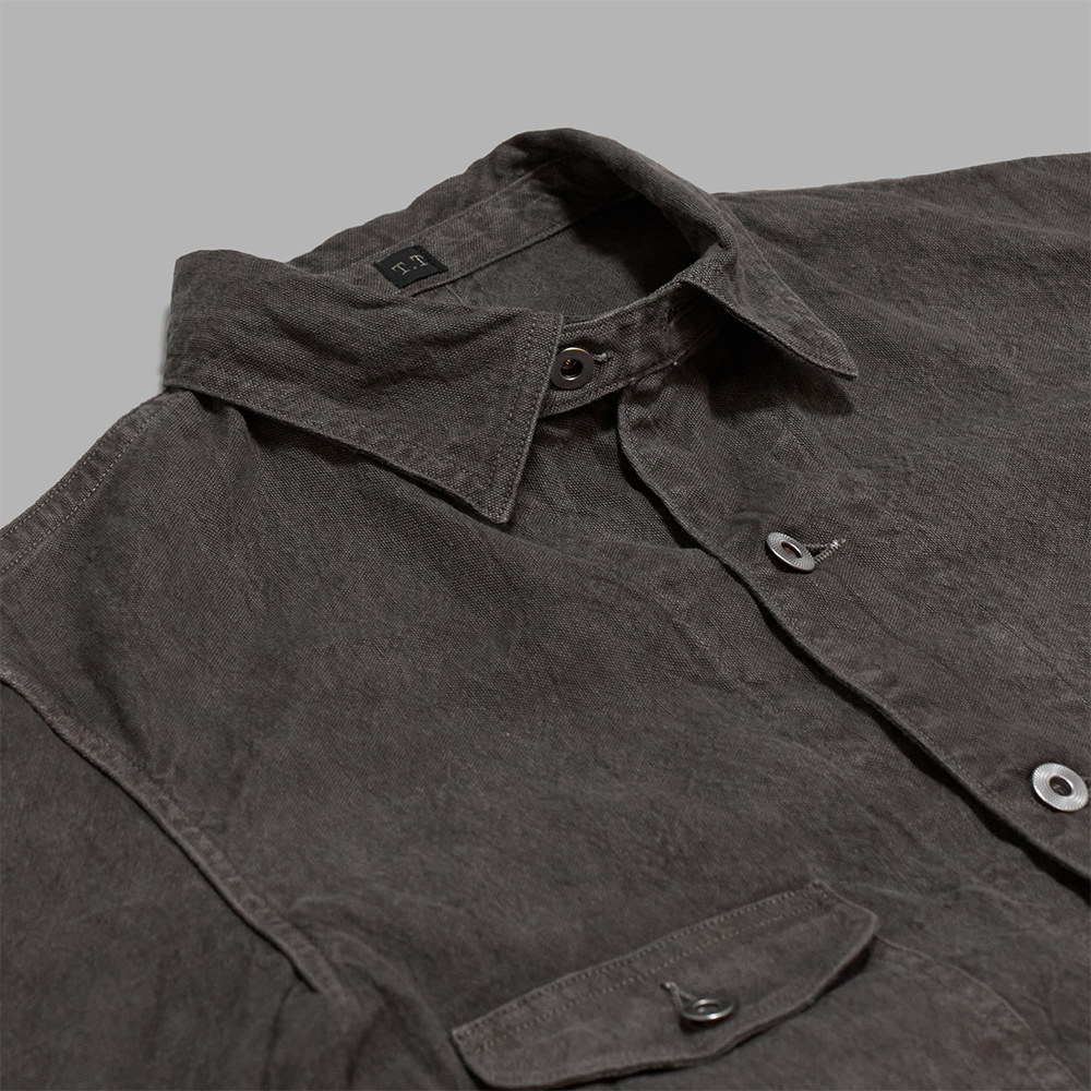 リネンとコットンを用いて織り上げた、ハリ感と柔らかさを兼ね備えた風合いのオックス素材を採用しています。染色は、日本の伝統染色技法の墨染めを用い、一枚一枚丁寧に染めることで、ひとつとして同じものがなく、唯一無二の表情が楽しめます。オーバーダイを施すことによって、適度に繊維が解れ、ヴィンテージの様な細かな毛羽感やクタリのある生地に仕上がっています。