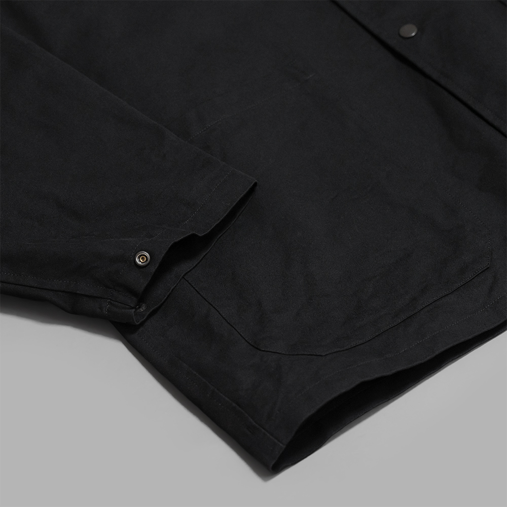 型は、ゆったりしたサイズ感で作られたカバーオール型のジャケットです。腰ポケットにドット釦のみのディティールで、匿名性の高いユニフォームのような雰囲気にしています。中はフラットなコットンネルの総裏で、内ポケットを2つ付けています。袖口にスナップが付きます。