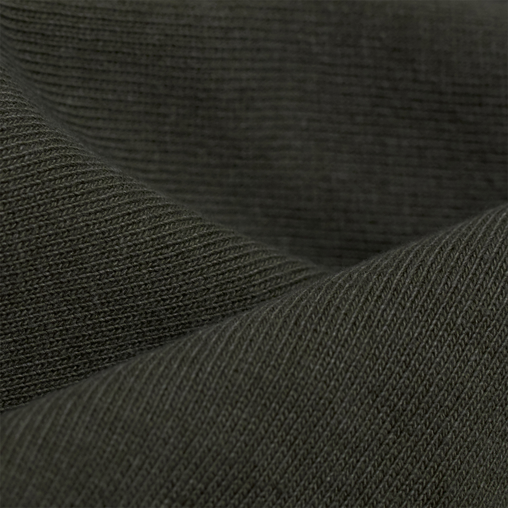 番手を解析し、ゲージや度目を細かく合わせて編み立てた、肉厚の空紡天竺を使用しています。太番手の空紡糸を引き揃えることで編み目を際立たせ、ヴィンテージ感のある雰囲気に仕上げています。