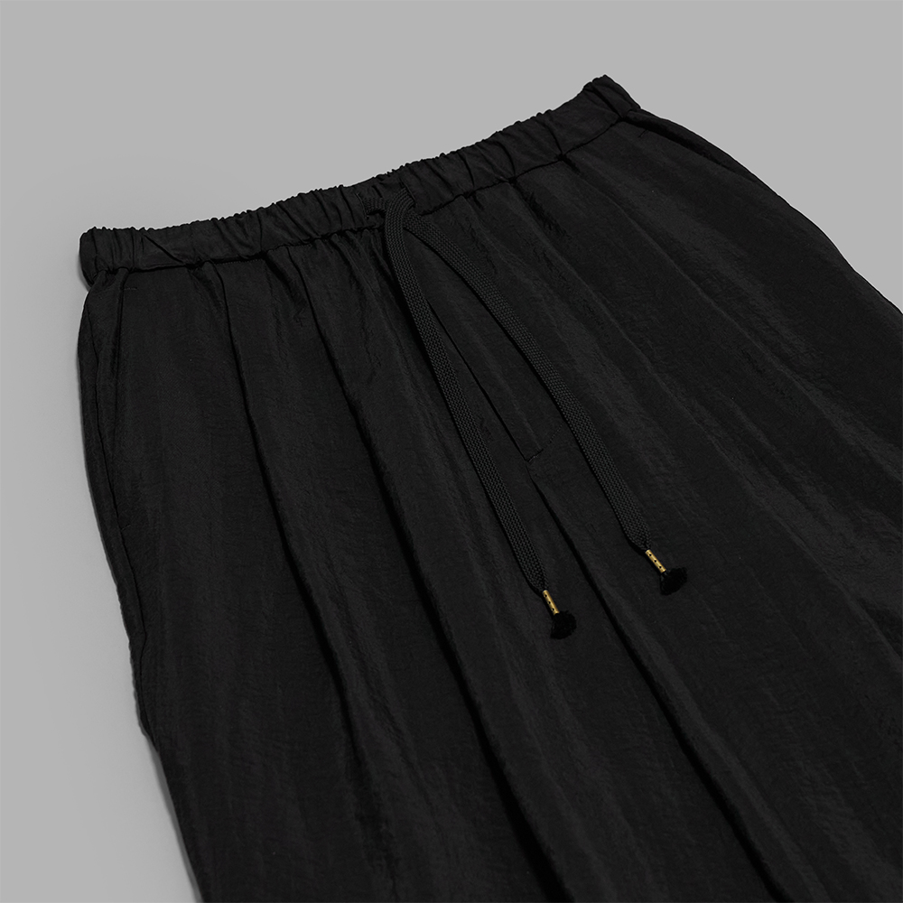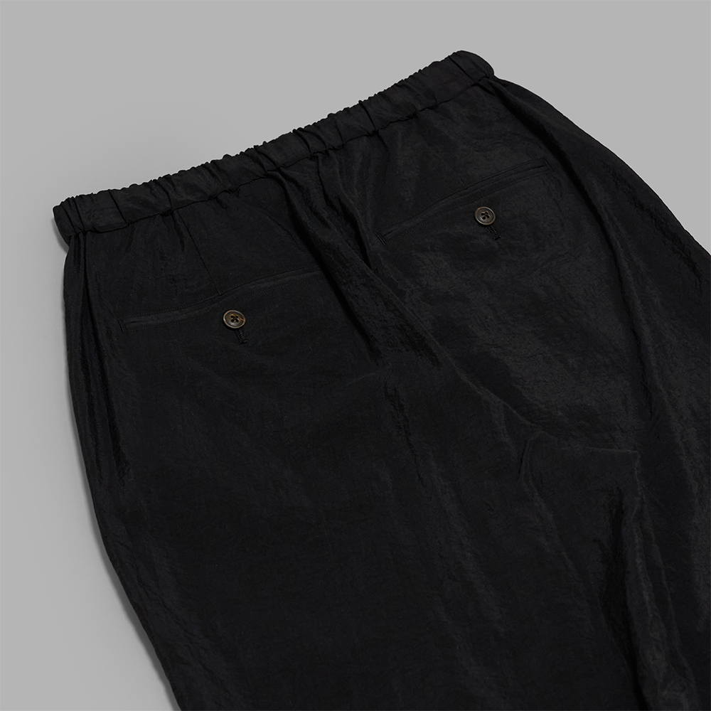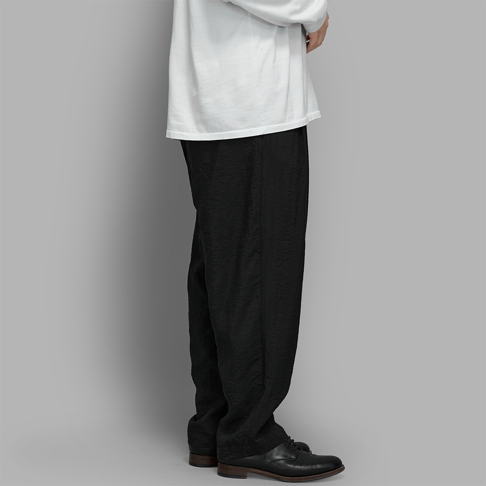 型は、股上をやや深くし、程良くリラックス感のあるシルエットに仕上げた、ダブルプリーツのイージーテーパードパンツです。リラックスした着用感でありながら、とても綺麗なテーパードのシルエットで、ジャケットなどに合わせてもバランスよく着用できます。ウエストにはゴムと紐が通り、前立てはジップフライ、裏地のない一重の使用です。