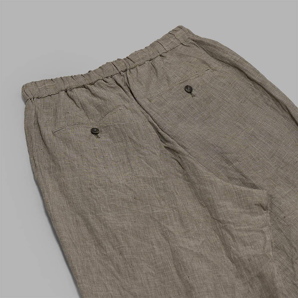 素材は、80番⼿の超極細リネンの⽣成り⽷と、ダークカーキに染⾊した⽷を使⽤して織り上げた、先染めの千⿃格⼦組織の⽣地を使用しています。経⽷には、合成繊維の⽔溶性ビニロンを巻き付けて織り上げ、ワッシャー加⼯の際にそのビニロンを溶解させ、”千⿃格⼦の繊細な組織と、ビニロンを溶かすことで⽣まれる微細な隙間と、ワッシャー仕上げによる柔らかな質感が⾒事に調和し、美しく奥⾏きのある⾵合いに仕上がっています。