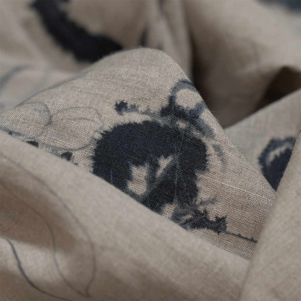 素材は、経緯⽷ともに極細リネンを使⽤した平織りの⽣地を使用しています。織布の際に経⽷が切れないよう、合成繊維の⽔溶性ビニロンを巻きつけてから織り上げ、その後ワッシャー加⼯を施してビニロンを溶かし、独特の⾵合いに仕上げています。さらに、尾州の加⼯場にて⽣成⾊のまま晒さず、プリントの下地加⼯を施した後、京都の染⼯場にてインクジェットプリントを施すことで、⿇特有のムラ感が残り、ナチュラルで味わいのあるプリント地に仕上がっています。