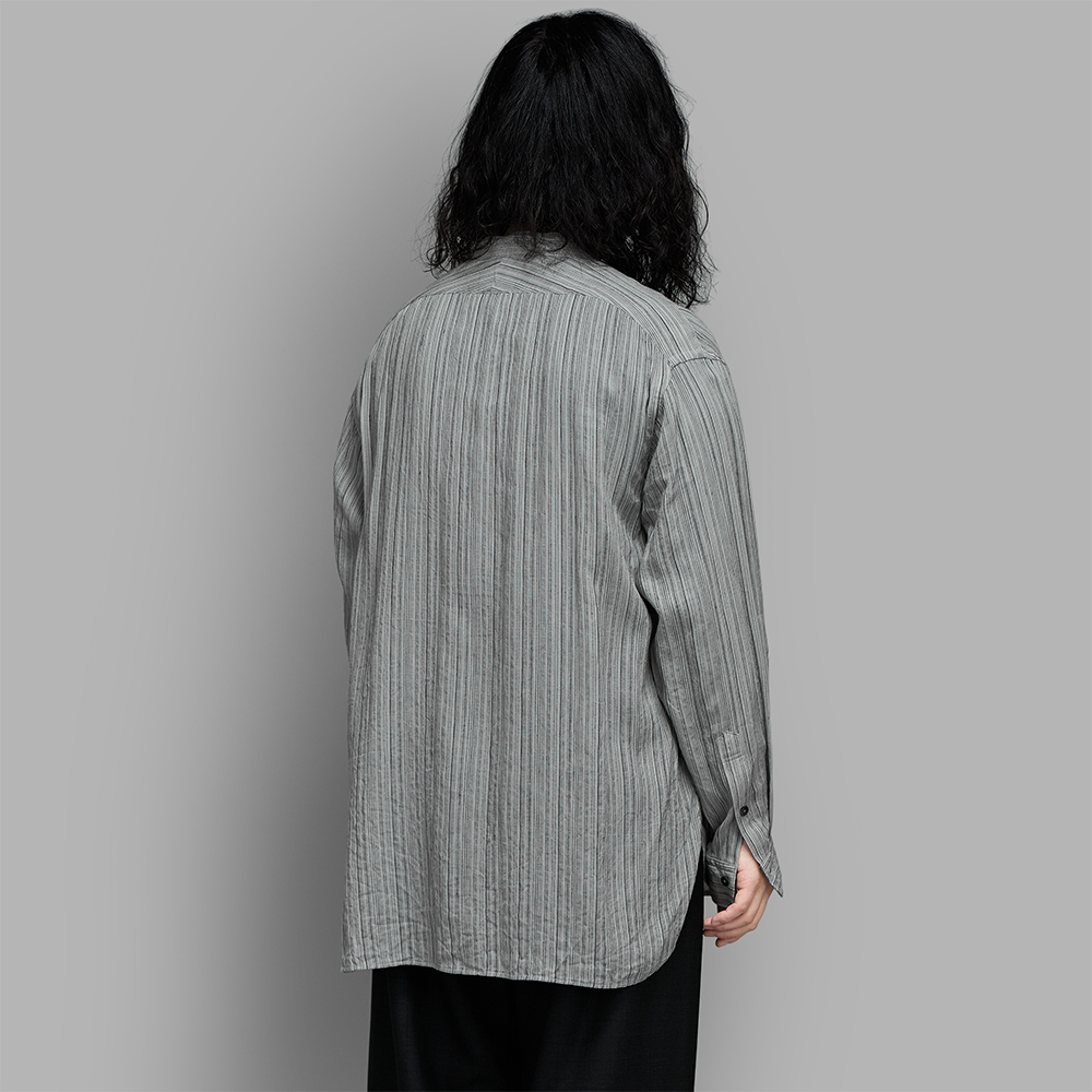 製品完成後には、丁寧な手洗いと天⽇乾燥を施すことで、味わい深いヴィンテージ感を表現しています。手作業による工程も多く含まれた、唯一無二の存在感のある1着は、シャツ1枚のスタイルでも、雰囲気のある着こなしを楽しめます。また、首元に綺麗にそうバンドカラーは、インナーにあわせた際の収まりがよく、ジャケット類のインナーにもおすすめです。