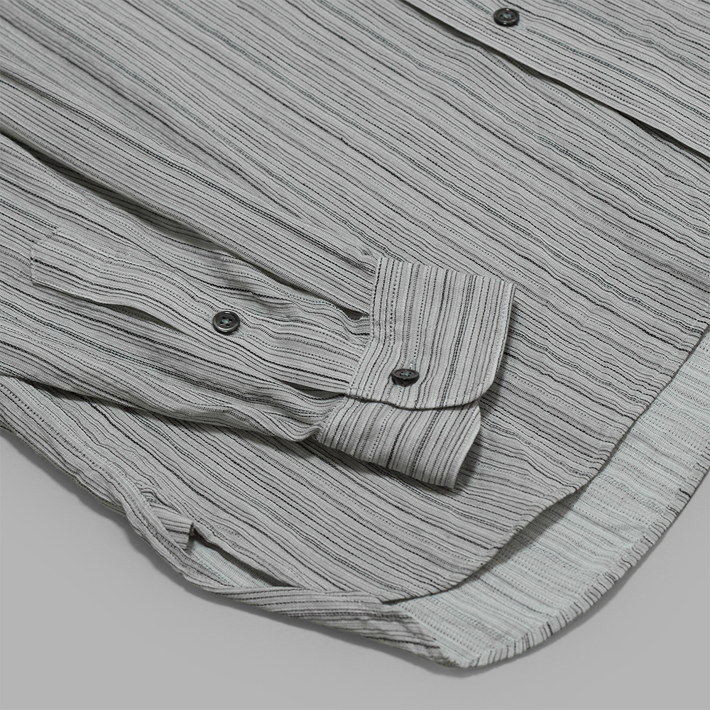 素材は、極薄のシャツ地に仕上げるため、経⽷に細番手のレーヨン⽷を採用し、緯⽷には一般的に薄手のシャツ等に使用される太さのコットン⽷、リネン⽷と、太めのコットン⽷をランダムに配置し、ジャカード織機にてボーダー柄に織り上げた生地を使用しています。ボーダー⽣地を横使いすることで、あえて縦ストライプのシャツ地として使⽤しています。清涼感あふれる⾵合いは、まるでインドの⼿織り布を思わせるような味わいを持ち、ナチュラルな表情に仕上がっています。