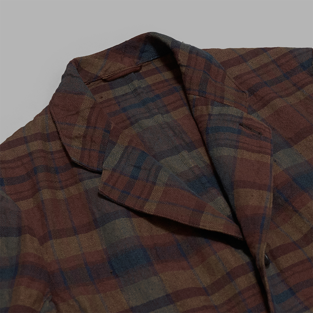 型は、イギリスのワークウェアをベースにデザインされたテーラーラペルのジャケットになります。全体的にゆとりを持たせながら、ウエストにはシェイプが入る独自の美しいフォルムです。中は、裏地のない一重仕立てで、襟裏にはボタンを配し、立てての着用も可能としています。