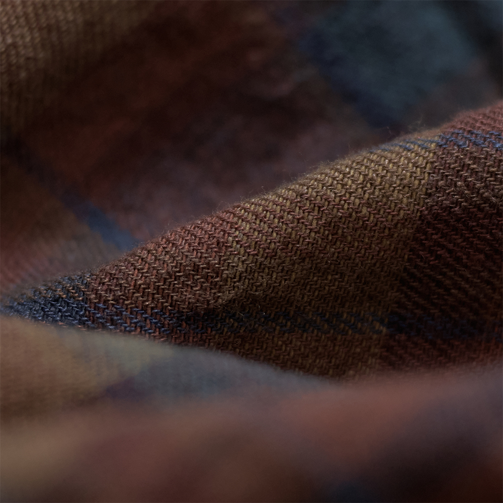 発色が良く鮮やかなものが多いマドラスチェックですが、こちらは製品染めによってダークトーンを重ね、深みのある色合いに仕上げています。スタイリングにも自然と馴染む、落ち着いた印象のマドラスチェックです。