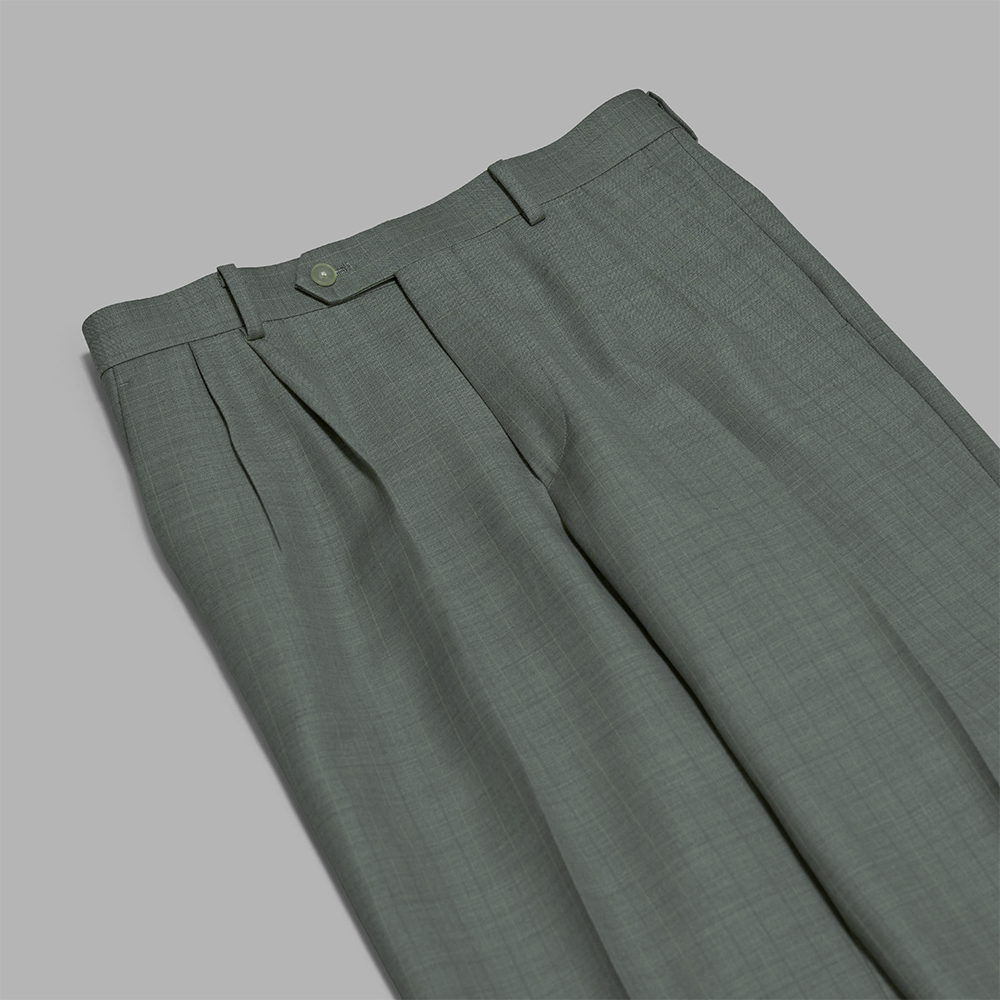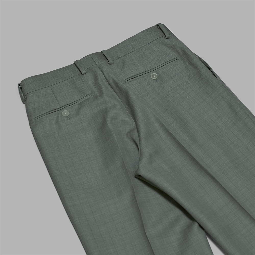 型はツータックのトラウザーで、腰回りに適度なゆとりをもたせ、膝下から裾にかけて緩やかにテーパードの入ったストレートシルエットです。前立てはジップフライ、腰裏はマーベルト、ヒップポケットは両玉縁で丁寧に仕立てています。中は半裏の仕様です。