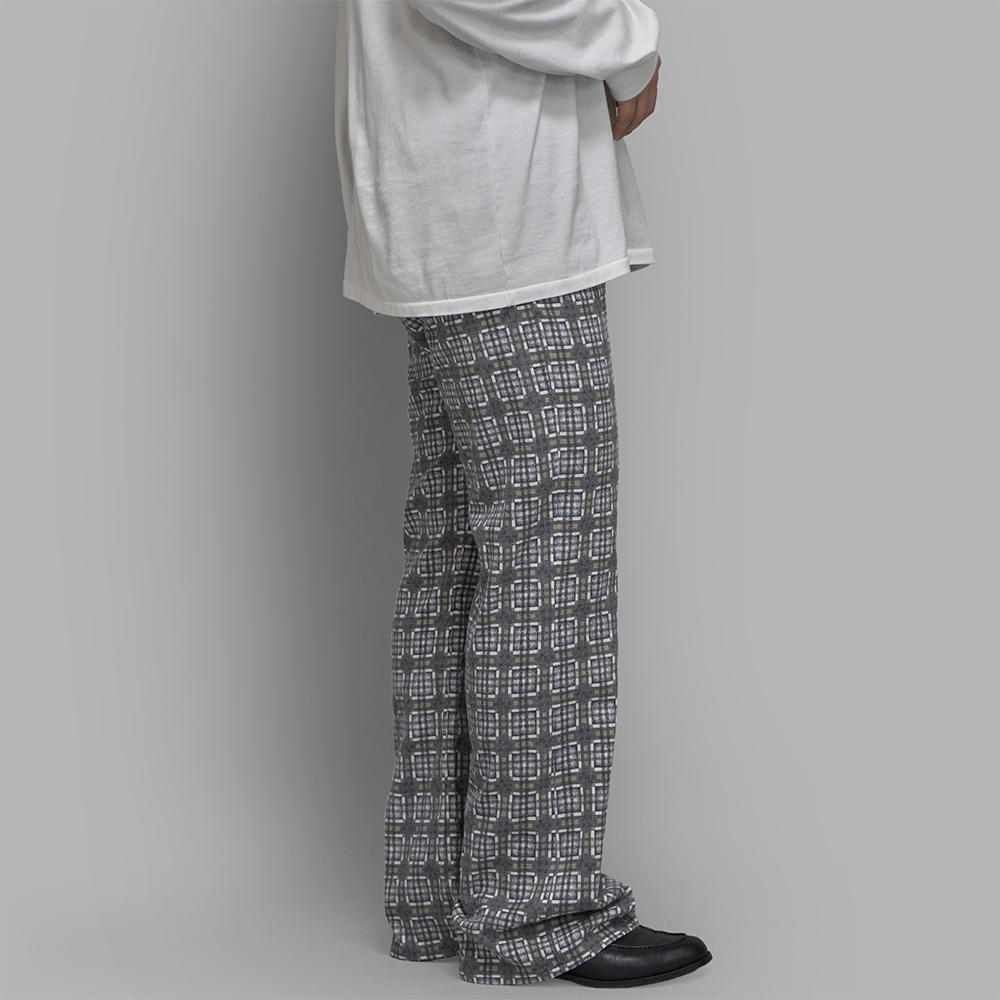 NICENESSのプリントネルチェック セミフレアイージーパンツです。