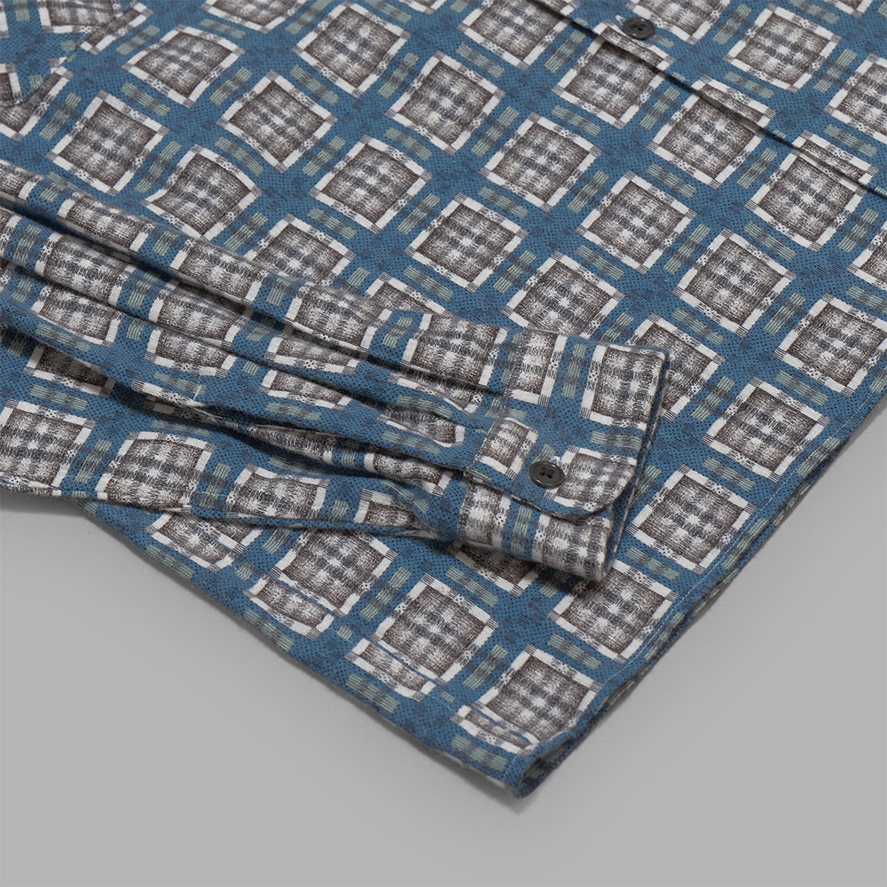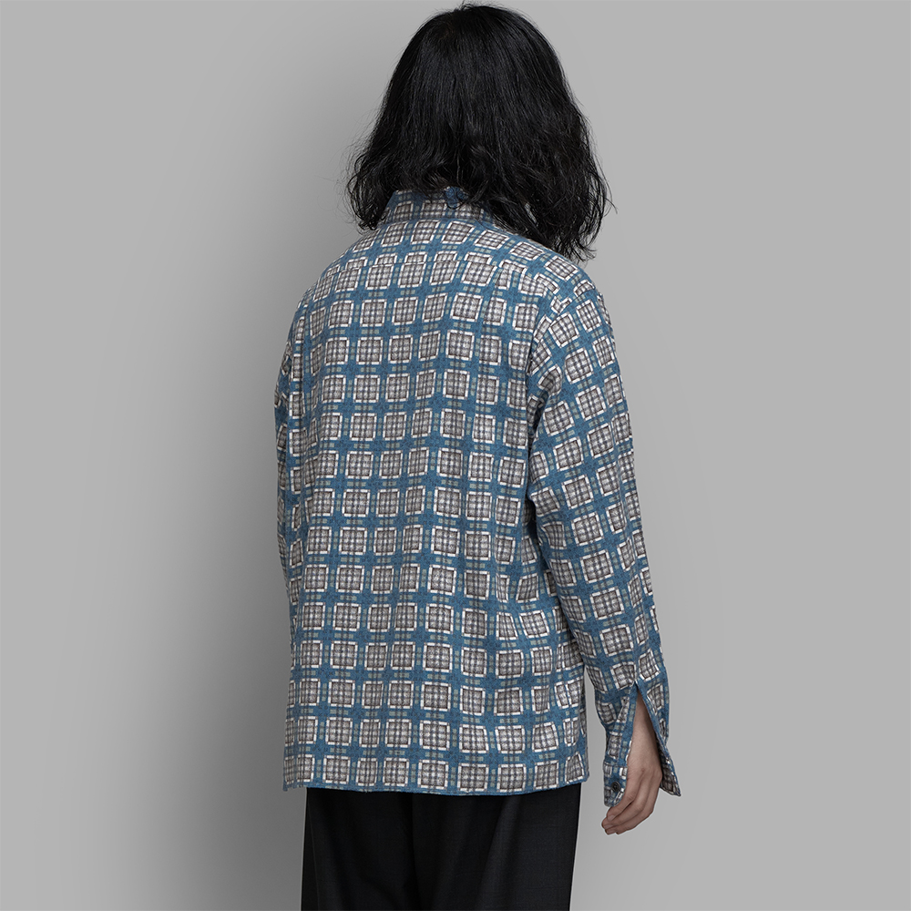 1940〜50年代のプリントネル素材をリファレンスに製作されたビスポーク生地を使用しています。当時のプリントは主に手作業によって施されており、生地表面を抜けて裏面にまでインクが付着する「裏抜け」が特徴であることから、繊細なチェック柄も崩れないように5版のハンドスクリーンプリントで丁寧に表現し、後起毛加工により柄の深みと独特の風合いを表現しています。