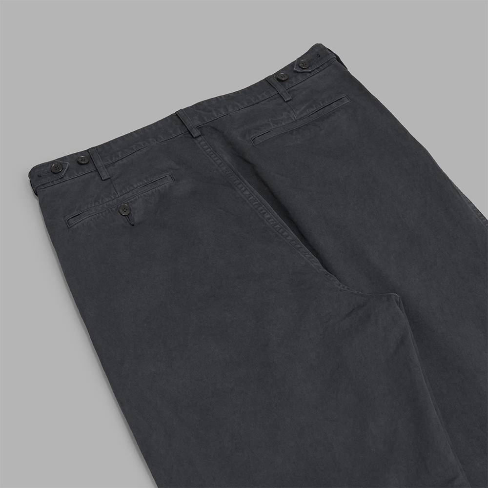 型は、縦ラインに綺麗に落ちるワイドストレート型のワンタックのパンツです。股上をやや深くし、程良くリラックス感のあるシルエットで製作されています。ウエストにはサイドアジャスターが付いており、左右で一段階サイズ調整が可能です。前立てはボタンフライで、裏地のない一重の仕様です。