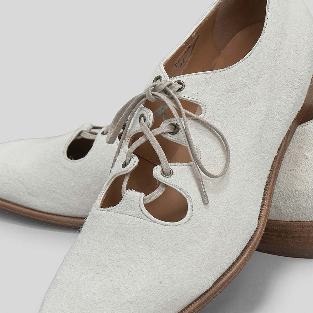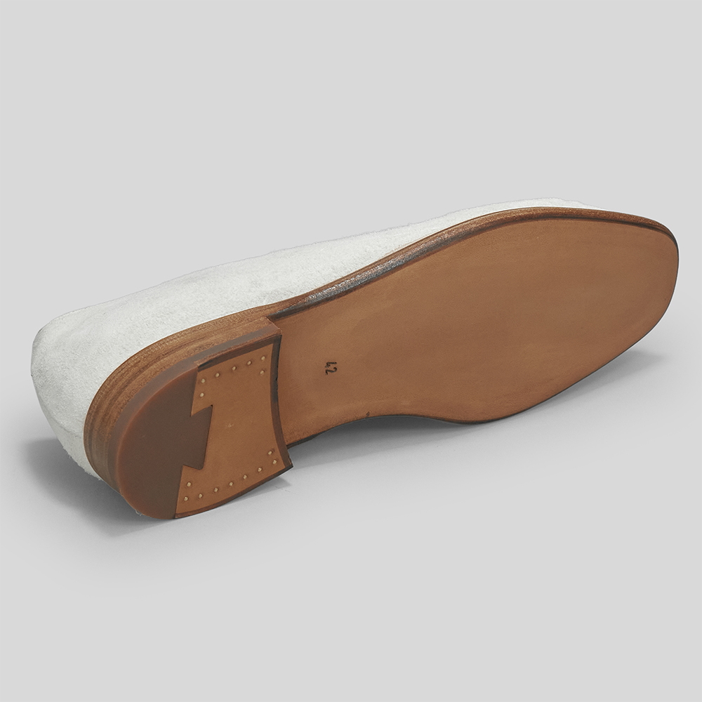 素材は、荒々しく長めの毛足で、ラフな表情が特徴的なホーススウェードをを使用しています。柔らかく、しっとりした素材感で、色は純白ではなく、ナチュラルなホワイトカラーで仕上げられていることにより、柔らかな雰囲気を演出してくれます。