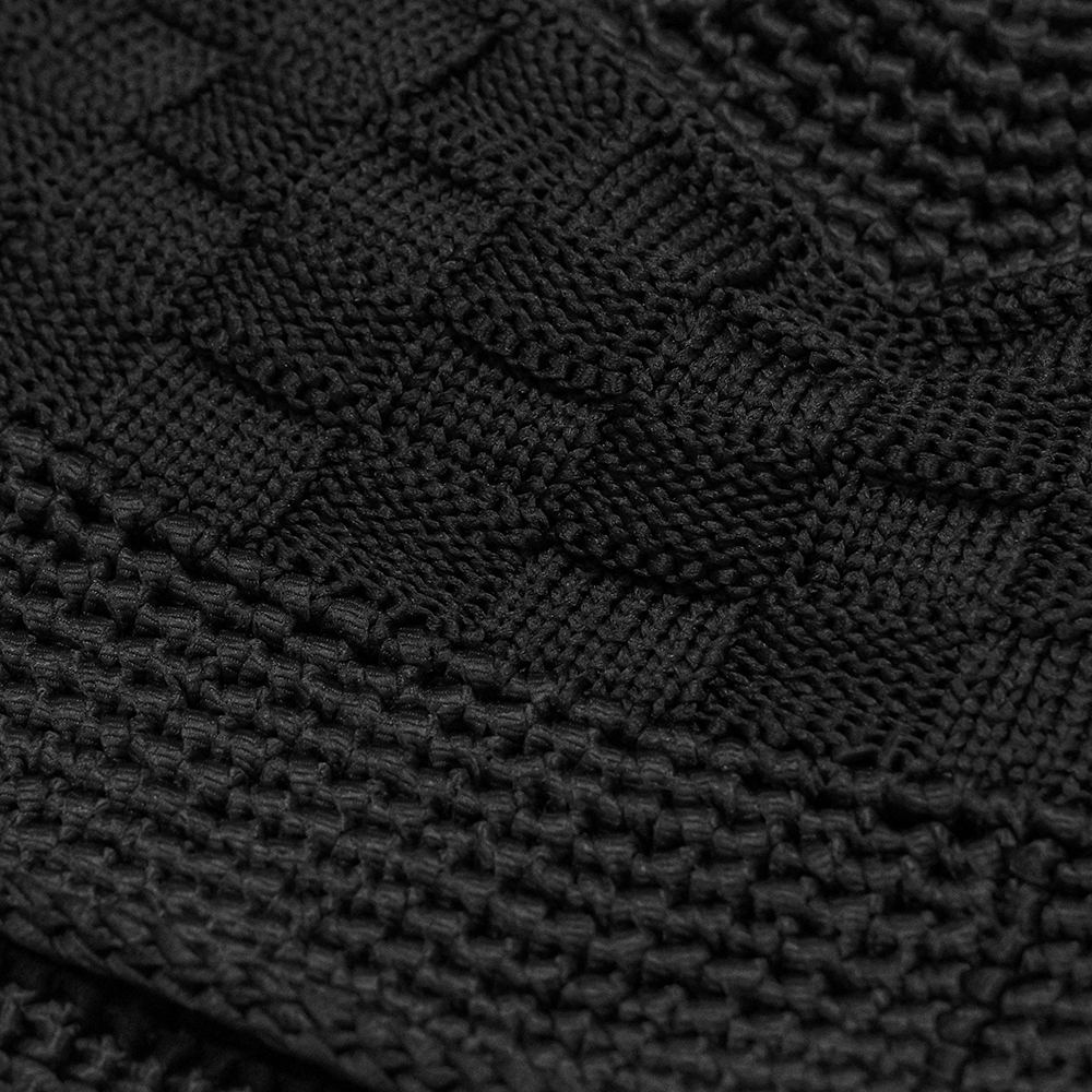 適度なハリと上品な光沢はありながらも、伸縮性と柔らかさも兼ね備えたポリエステルニット素材を使用しています。手編みと編み機を用いて作製されており、ハンドメイドの温もりは残しつつも、均一でシャープな編み模様が表現された、モダンな仕上がりです。