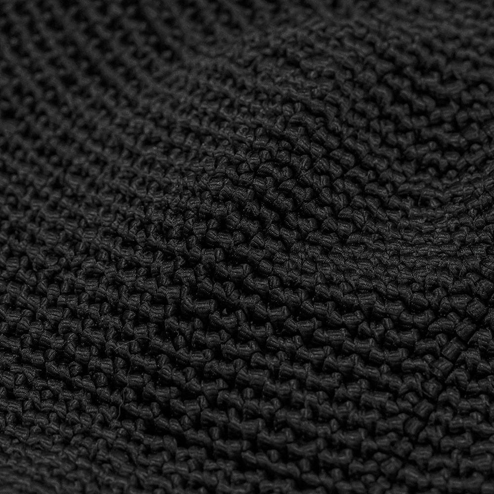 適度なハリと上品な光沢はありながらも、伸縮性と柔らかさも兼ね備えたポリエステルニット素材を使用しています。手編みにより、程よく網目に緩さがあるため、通気性にも優れています。