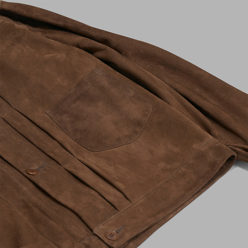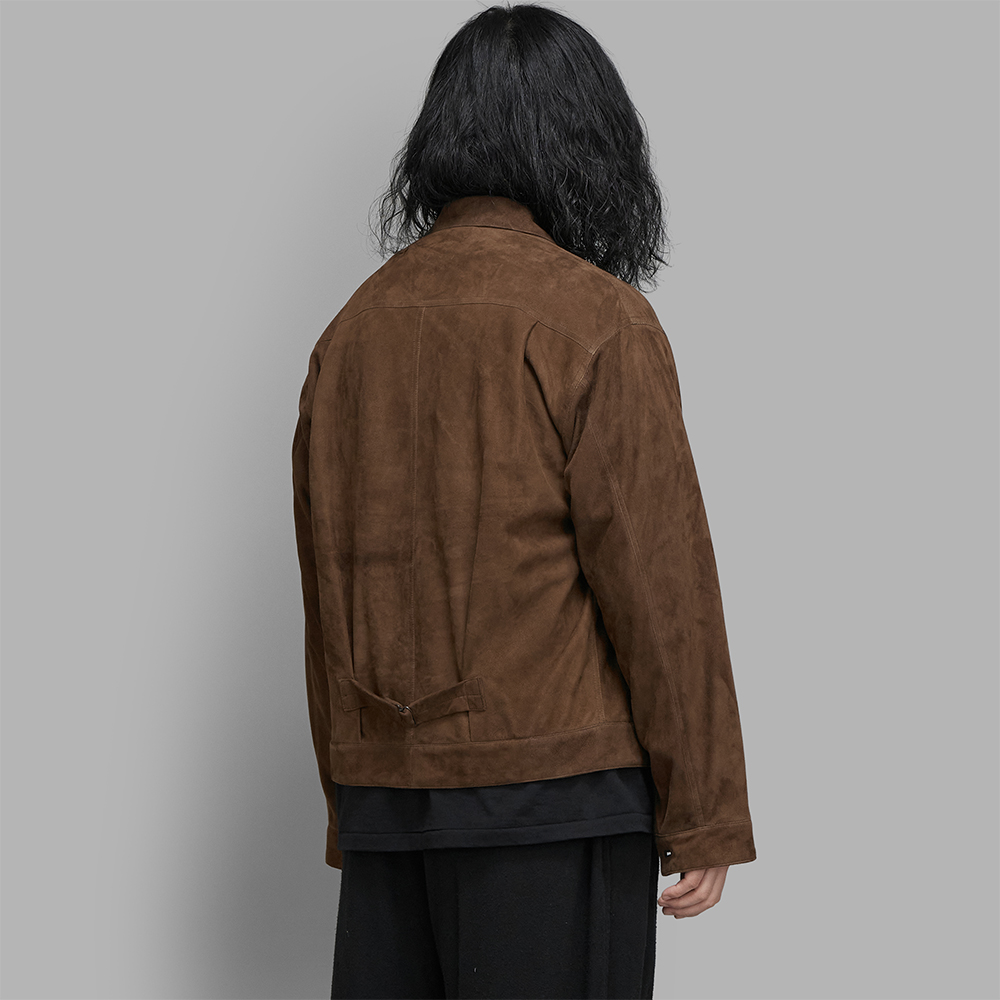 柔らかく薄手のスウェードレザーで作製された1st型のジャケットです。柔らかく、くったりとした落ち感のある表情が、1st型のデザインと調和しています。